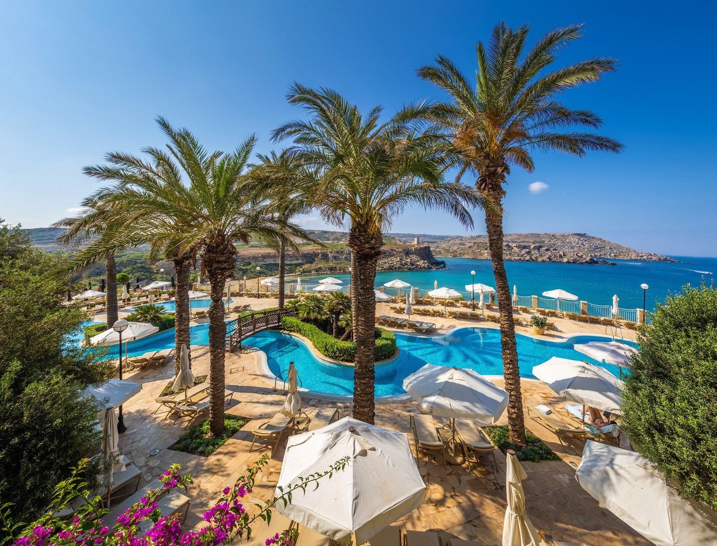 Luxusní elegantní hotel se skládá z hlavní budovy a dvou vedlejších budov. Leží na severozápadě ostrova v klidné lokalitě, nabízí krásné panoramatické výhledy na moře. Turistické letovisko St. Paul's Bay se spoustou obchodů, barů a restaurací se nachází cca 6 km od hotelu. Zastávka autobusu cca 300 m od hotelu. Hlavní město Valletta cca 21 km, letiště cca 20 km od hotelu. Nejbližší lékárna se nachází cca 4 km od hotelu.