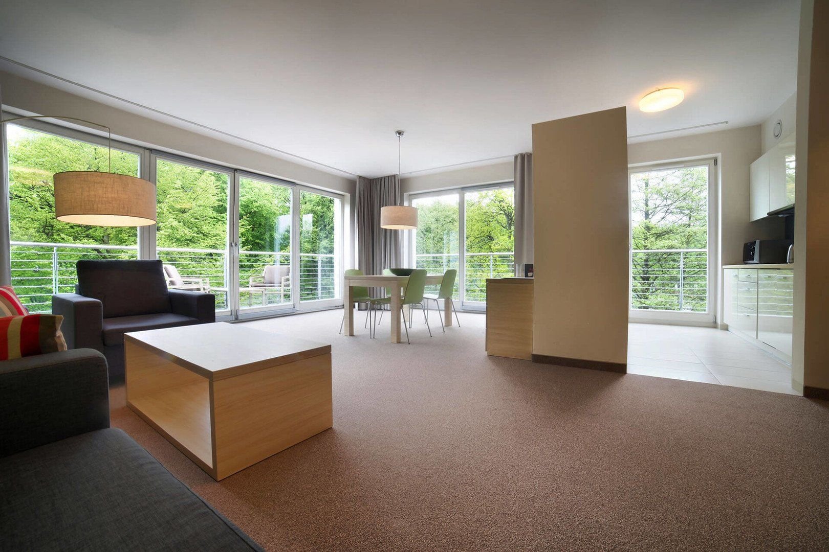 Moderní apartmány mají ložnici s manželskou postelí, obývací pokoj, vybavenou kuchyňku (varná deska, chladnička, rychlovarná konvice, mikrovlnná trouba, myčka) a vlastní příslušenství (koupelna, fén, WC). Dále jsou vybaveny TV, telefonem a Wi-Fi připojením. Některé apartmány mají i balkon.