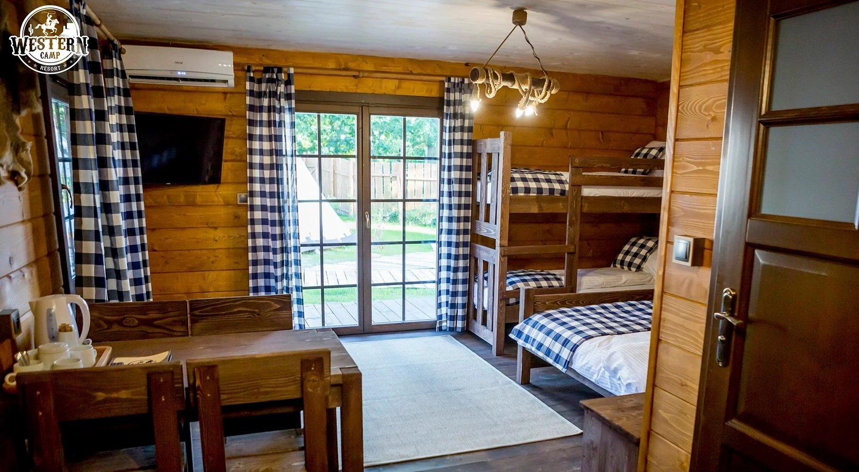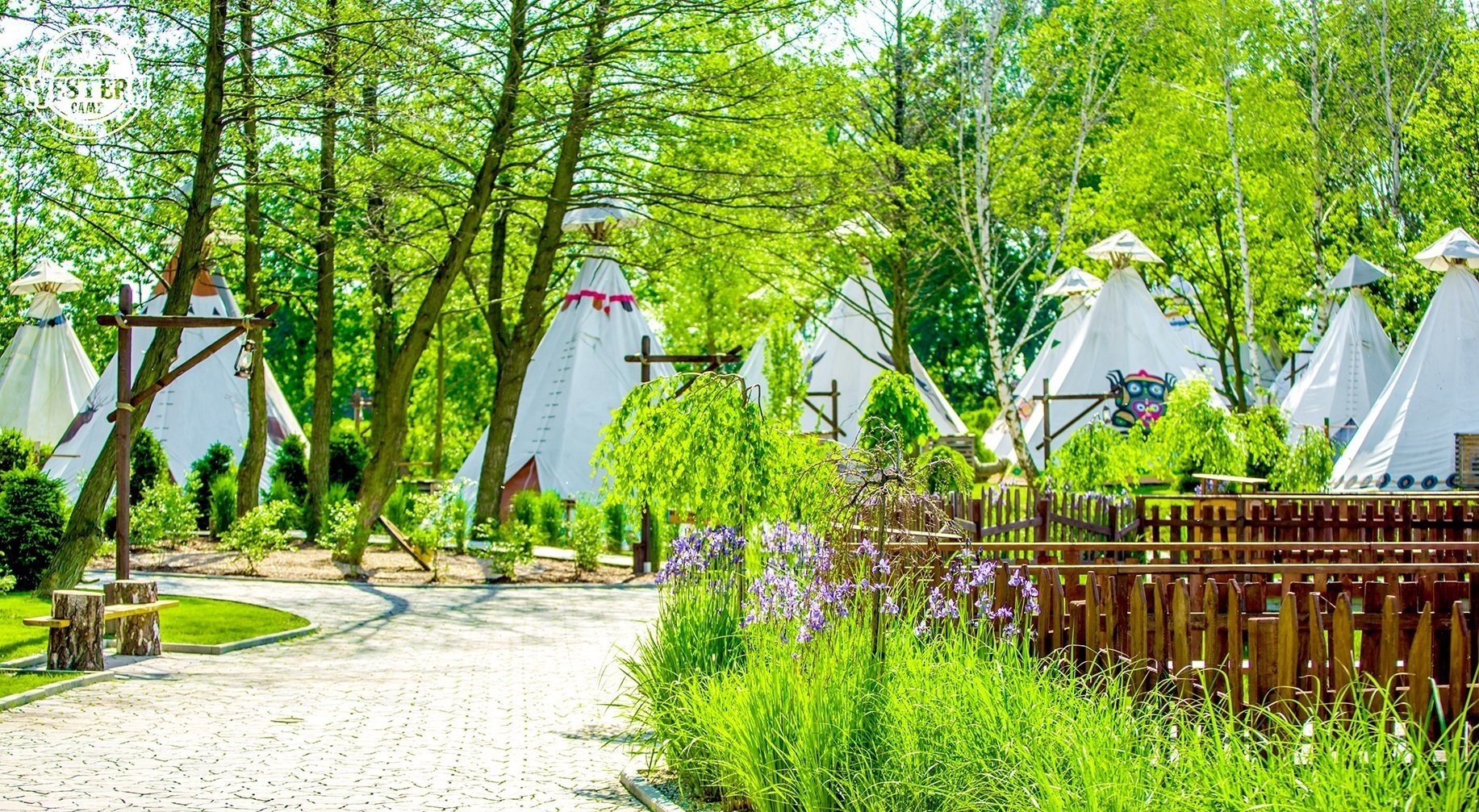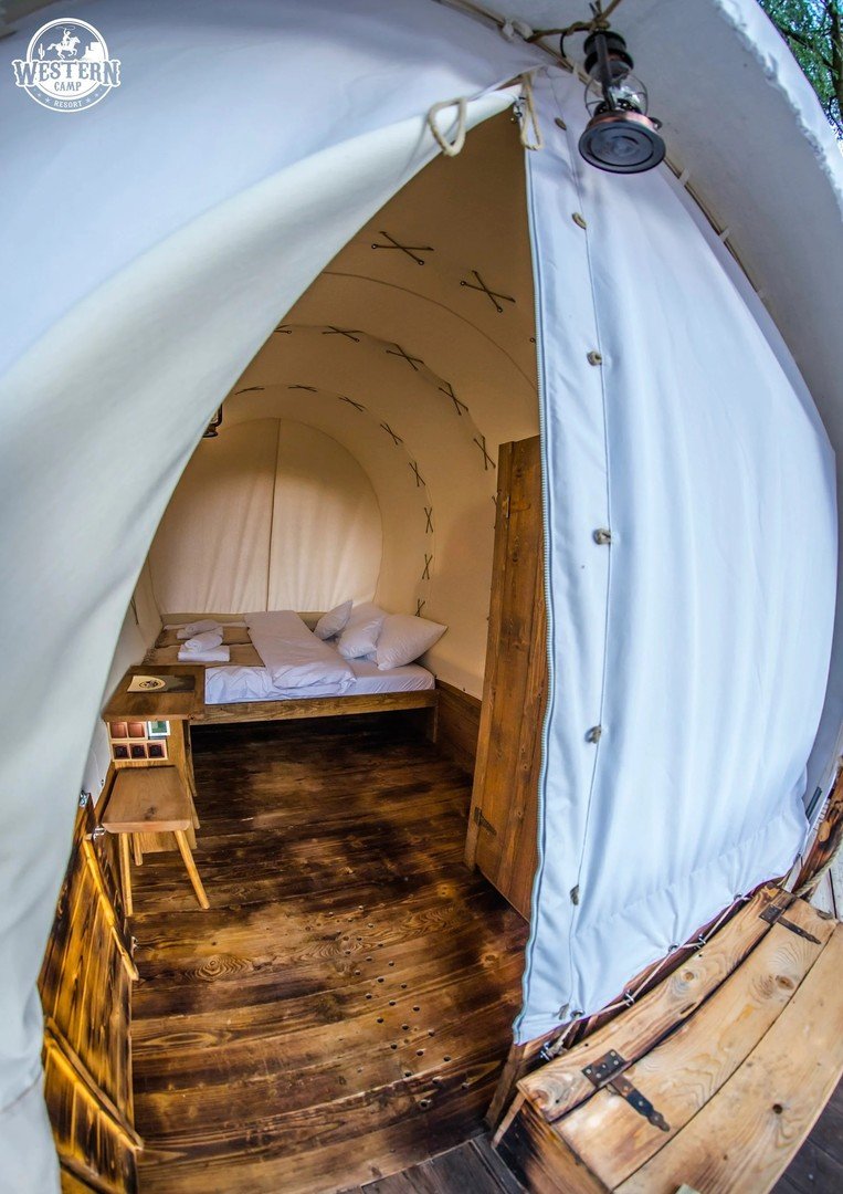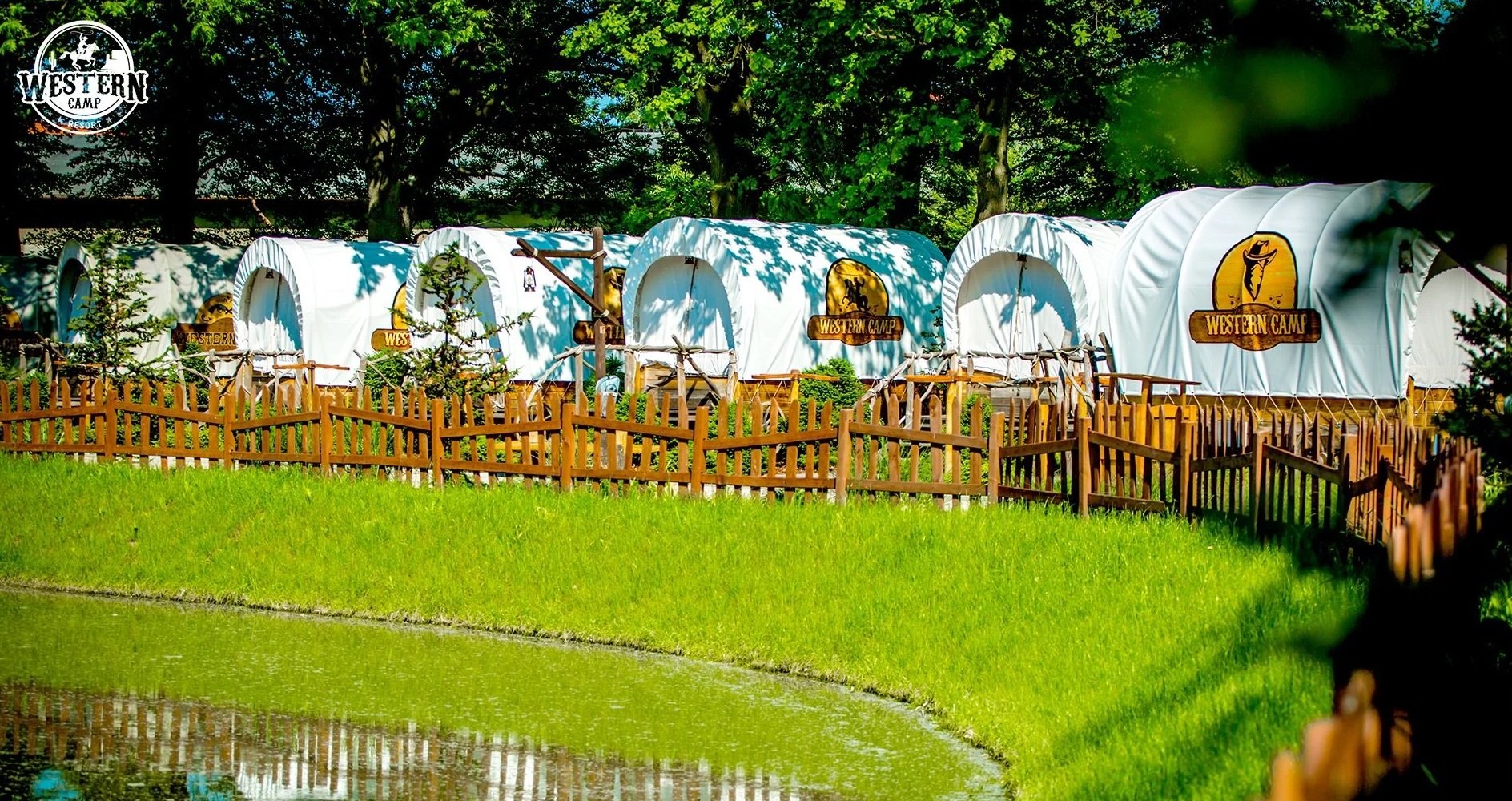 Ubytování je možné v kovbojském voze, indiánském týpí nebo v domku šerifaKovbojský vůz: vyzdobený vůz do pionýrských motivů je vybaven manželskou postelí nebo 2x patrovou postelí, klimatizací/topením a Wi-Fi připojením. K dispozici jsou také ručníky, povlečení a deky. Samozřejmostí je přístup k společným sprchám a toaletám. Indiánské teepee: nabízí možnost vyzkoušet si život opravdových indiánů. Týpí je vybaveno 4x jednotlivými postelemi, klimatizací/topením a Wi-Fi připojením. K dispozici jsou také ručníky, povlečení a deky. Samozřejmostí je také přístup ke společným sprchám a toaletám.Domek šerifa: moderní domek ve stylu divokého západu je vybaven vlastním soc. zařízením (koupelna, WC, fén na vlasy), klimatizací/topením, ledničkou, TV/Sat. a Wi-Fi připojením. K dispozici je také set na kávu a čaj, ručníky, povlečení a deky.