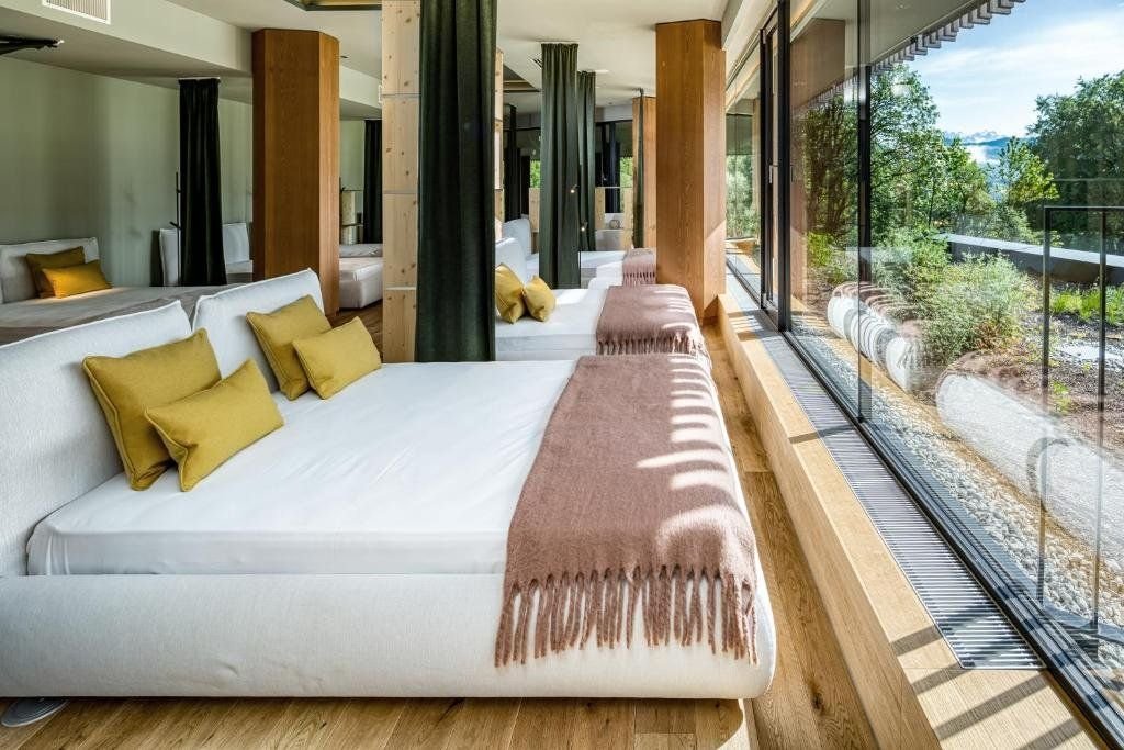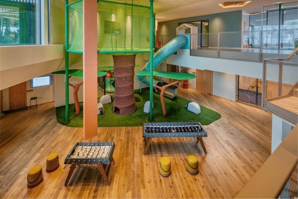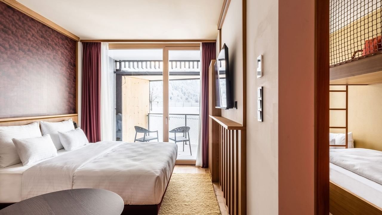 123 prosvětlených rodinných pokojů a apartmá si Vás získají svým alpským, moderním a sofistikovaným designem. Pro rodiny s dětmi jsou připraveny prostorné rodinné apartmány. Pokoj Superior - 42 m²- pro 2 dospělé + 2 děti, lodžie, pohovka, prostorná koupelna s sprchou a odděleným WC, satelitní TV, telefon, trezore, vlastním bare a klimatizace.Pokoj Family Suite - 56 m²- pro 2 dospělé + 2 děti s oddělenou ložnicí pro děti, lodžie, pohovka, dvě koupelny se sprchou a odděleným WC, satelitní TV, telefon, trezore, vlastním bare a klimatizace.Pokoj Grand Deluxe - 44 m²- pro 2 dospělé + 2 děti, lodžie, pohovka, prostorná koupelna s sprchou a odděleným WC, satelitní TV, telefon, trezore, vlastním bare a klimatizace.Všechny pokoje mají působivý výhled na hory, většina má balkon, terasu nebo lodžii, prostornou koupelnu, samostatné WC, satelitní TV, telefon, trezor. soukromý bar a klimatizaci.