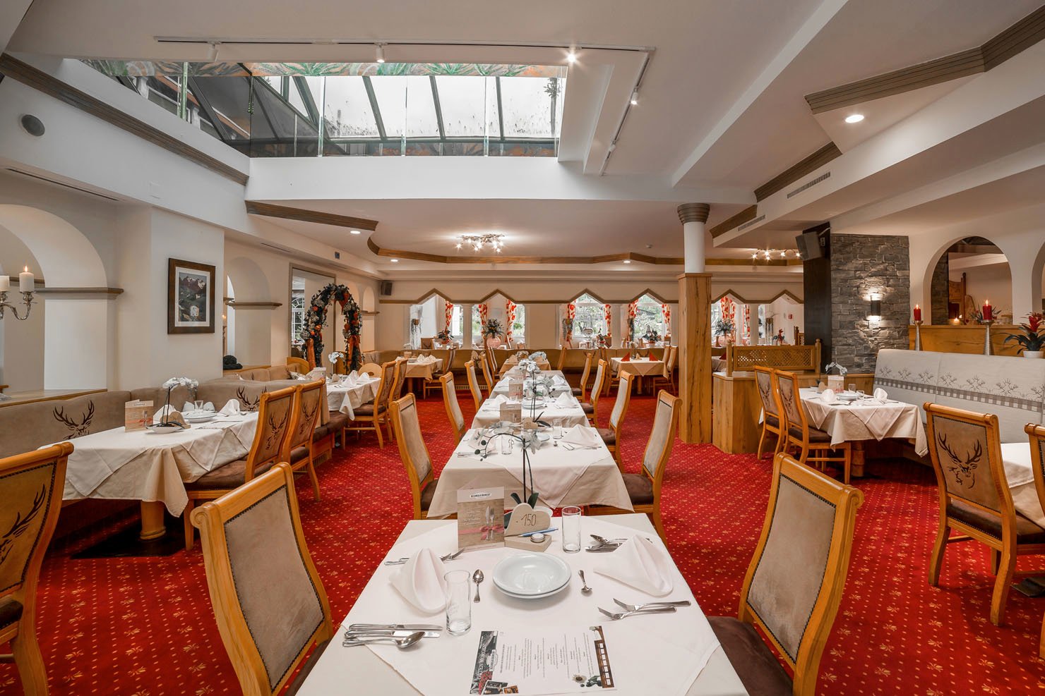 Polopenze+Snídaně formou vydatného bufetu s bio produkty až do 11 hodin, odpoledne lyžařské občerstvení včetně nápojů, večeře se podává formou 4-chodového menu + salátový bufet. Silvestrovská gala večeřě: 5-chodové menu, sekt a půlnoční bufet v ceně pobytu.