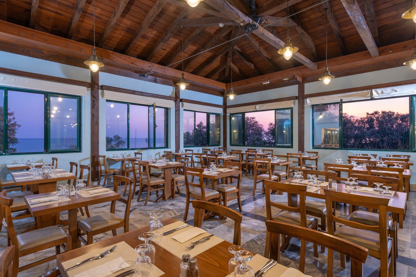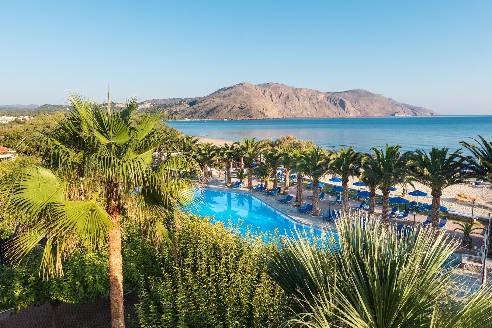 Písčitá pláž Almiros s pozvolným vstupem do moře se nachází přímo u hotelu; slunečníky, osušky a lehátka jsou na pláži zdarma.