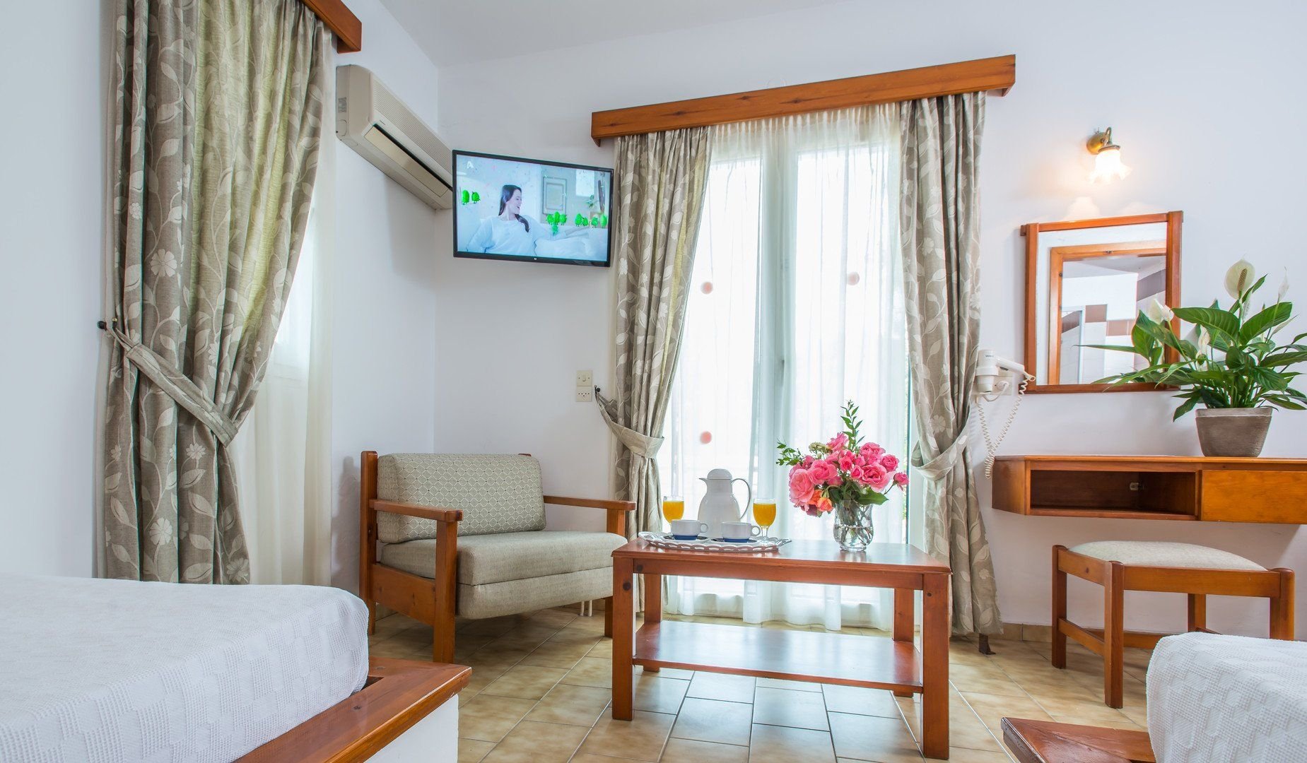 Standardní dvoulůžkové pokoje s možností přistýlky mají vlatní sociální zařízení (koupelna, WC), klimatizaci, TV, telefon, ledničku, balkón nebo terasu. Za příplatek pokoje s výhledem na moře.Za příplatek bungalovy - v zahradě po levé straně od hlavní budovy (mají stejné vybavení jako standardní pokoje). Pevná lůžka jsou zde oddělená a pevně zabudovaná, tedy je nelze dát k sobě. Za příplatek prosotrnější bungalovy s výhledem na moře s možností až dvou přistýlek.
