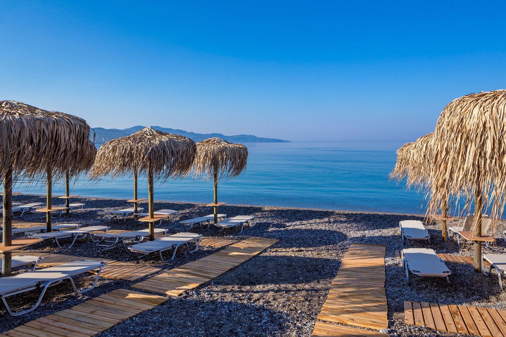 Písčito-oblázková pláž s pozvolným vstupem do moře je přímo u hotelu, oddělena místní komunikací. Lehátka a slunečníky na pláži zdarma.