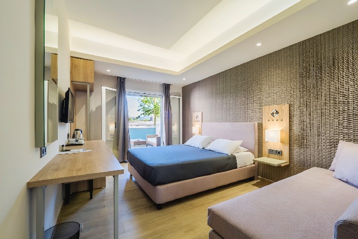 Dvoulůžkový pokoj s výhledem do zahrady nebo na bazén a balkonem má cca 18 m² a je vybaven manželskou postelí nebo dvěma samostatnými lůžky, minibarem (za poplatek), WiFi, trezorem (na kauci), TV/sat., individuálně ovladatelnou klimatizací, koupelnou se sprchou. Třílůžkový pokoj s výhledem do zahrady nebo na bazén má stejné vybavení, je prostornější (cca 26 m²). Bez balkonu, s rozkládací pohovkou pro třetí osobu.