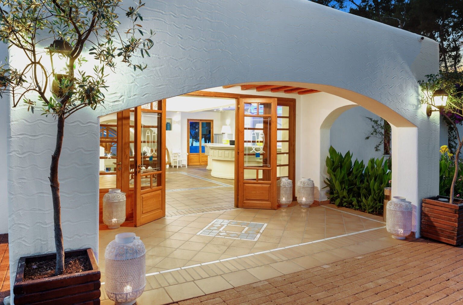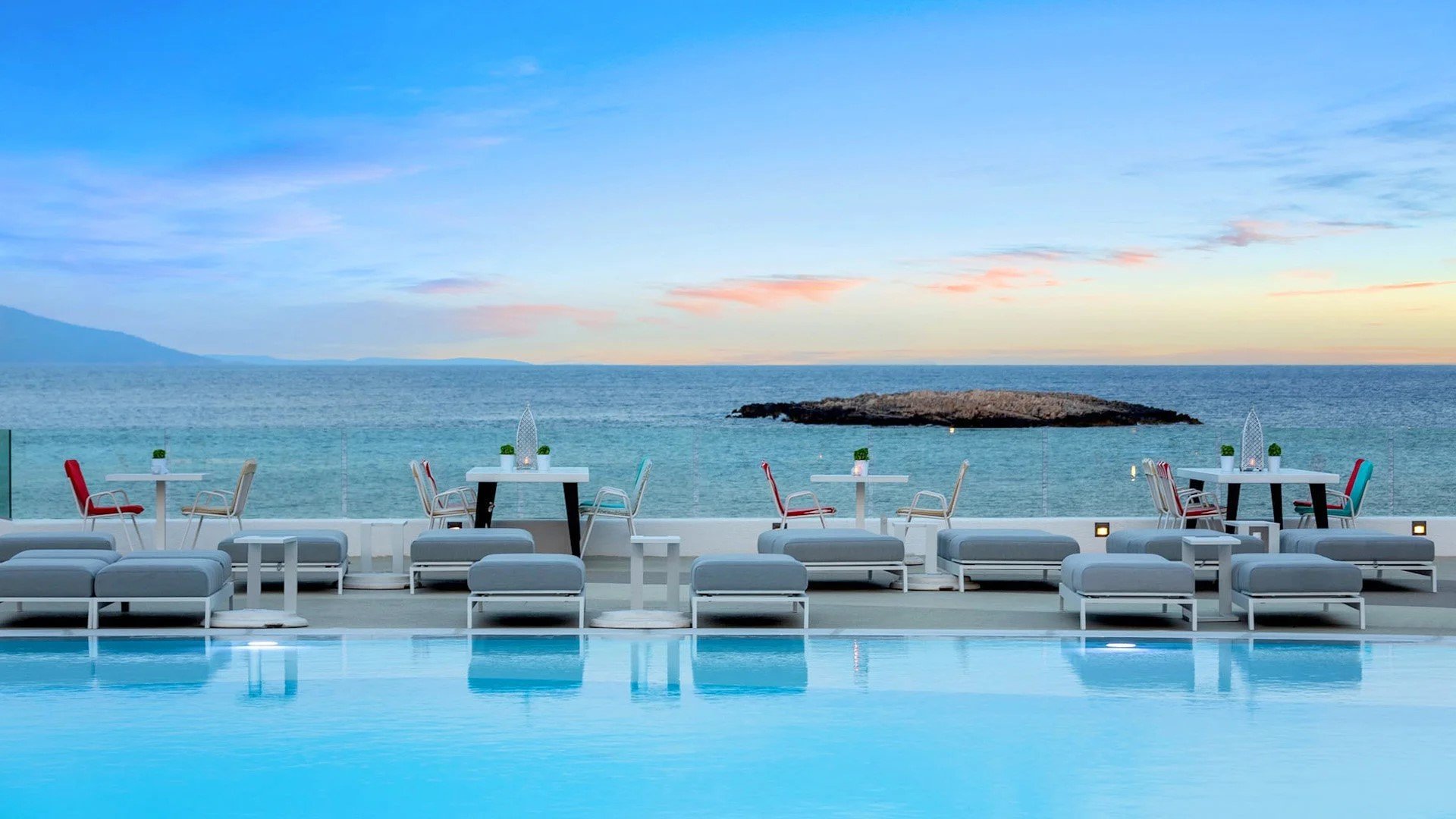All inclusive zahrnuje snídaně (7:30-10:30), obědy (12:30-14:30) a večeře (19:00-21:30) formou bufetu v hlavní restauraci, dopolední a odpolední občerstvení v baru u bazénu, místní nealkoholické a alkoholické nápoje v místech a časech určených hotelem.Večeře o 3 chodech v restauraci Achinos (1x během pobytu, po předchozí rezervaci).