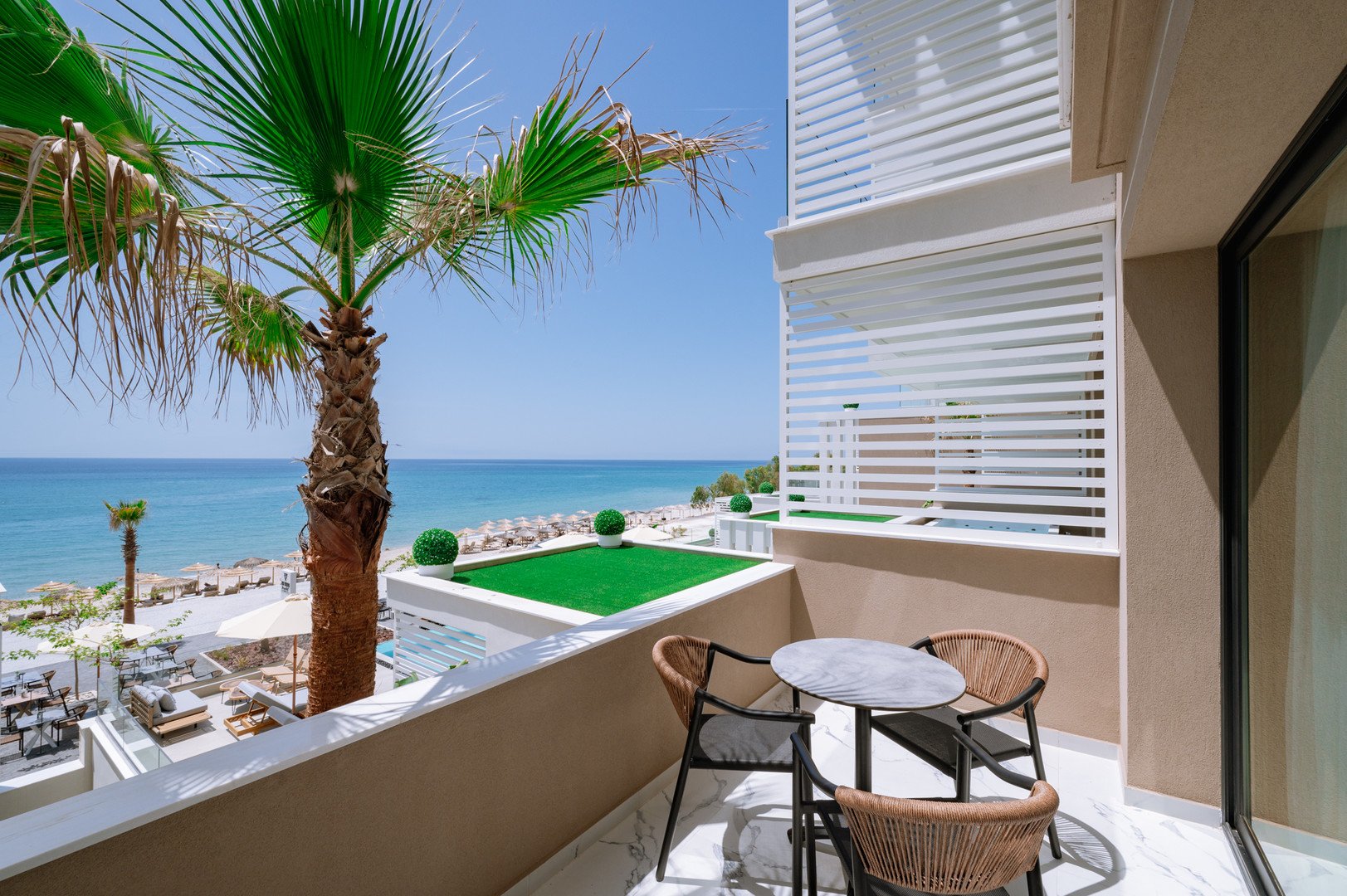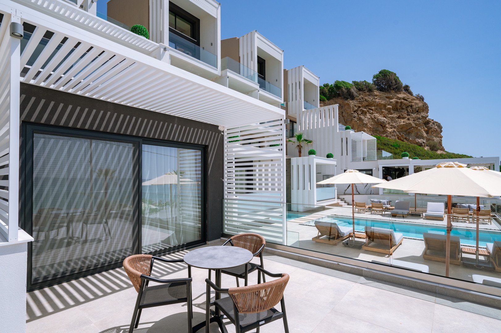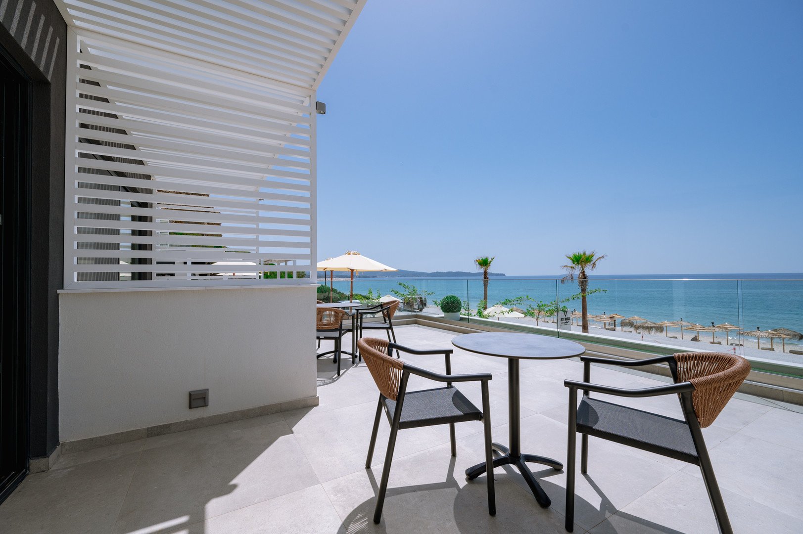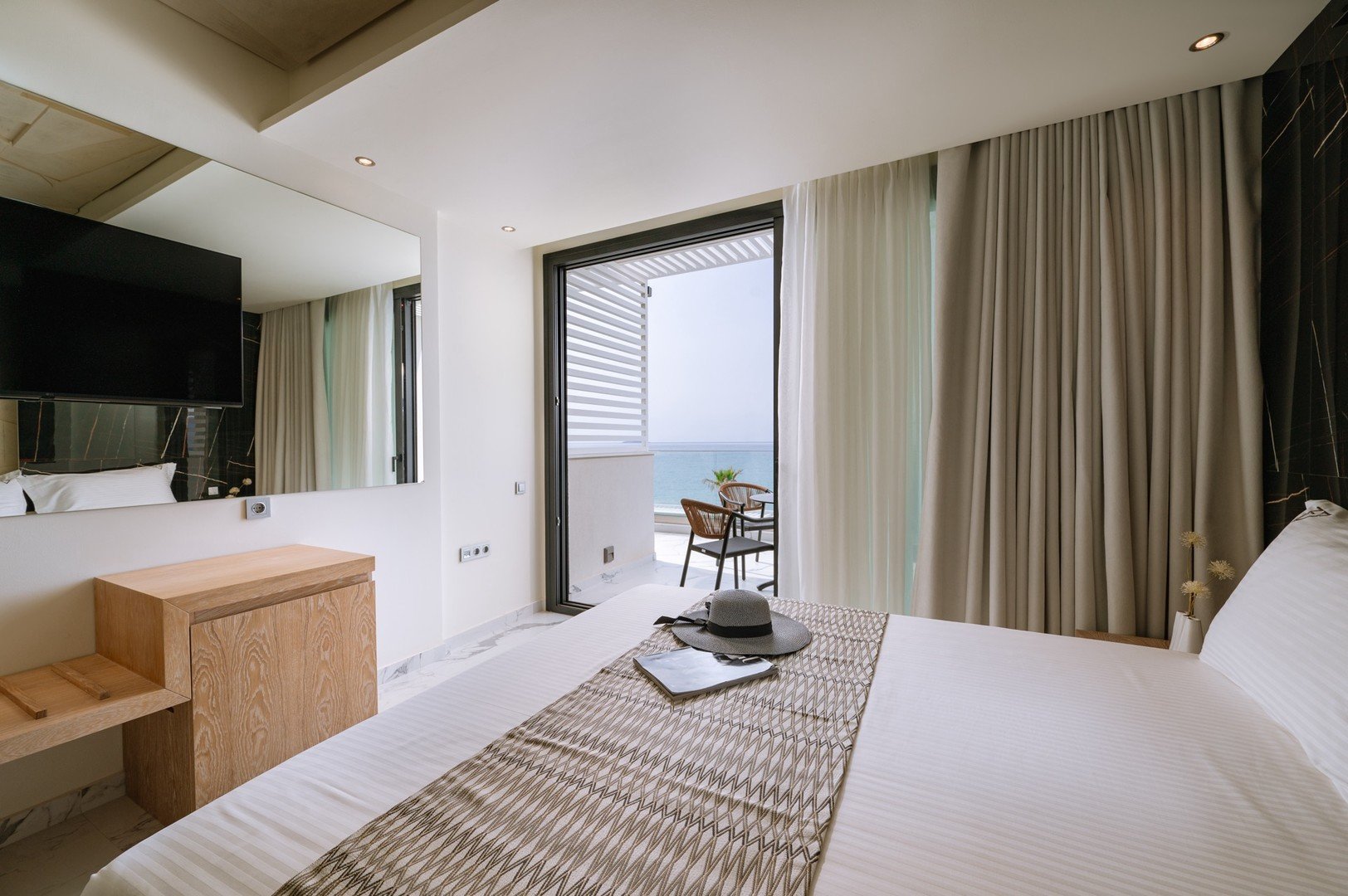 Deluxe dvoulůžkové pokoje s výhledem na moře bez možnosti přistýlky jsou vybaveny vlastní koupelnou (WC, sprcha, fén), WiFi, klimatizace, trezor, balkón nebo terasa.Za příplatek prostornější pokoje Junior Suite s výhledem na moře nebo na vyžádání Mezonetové pokoje.