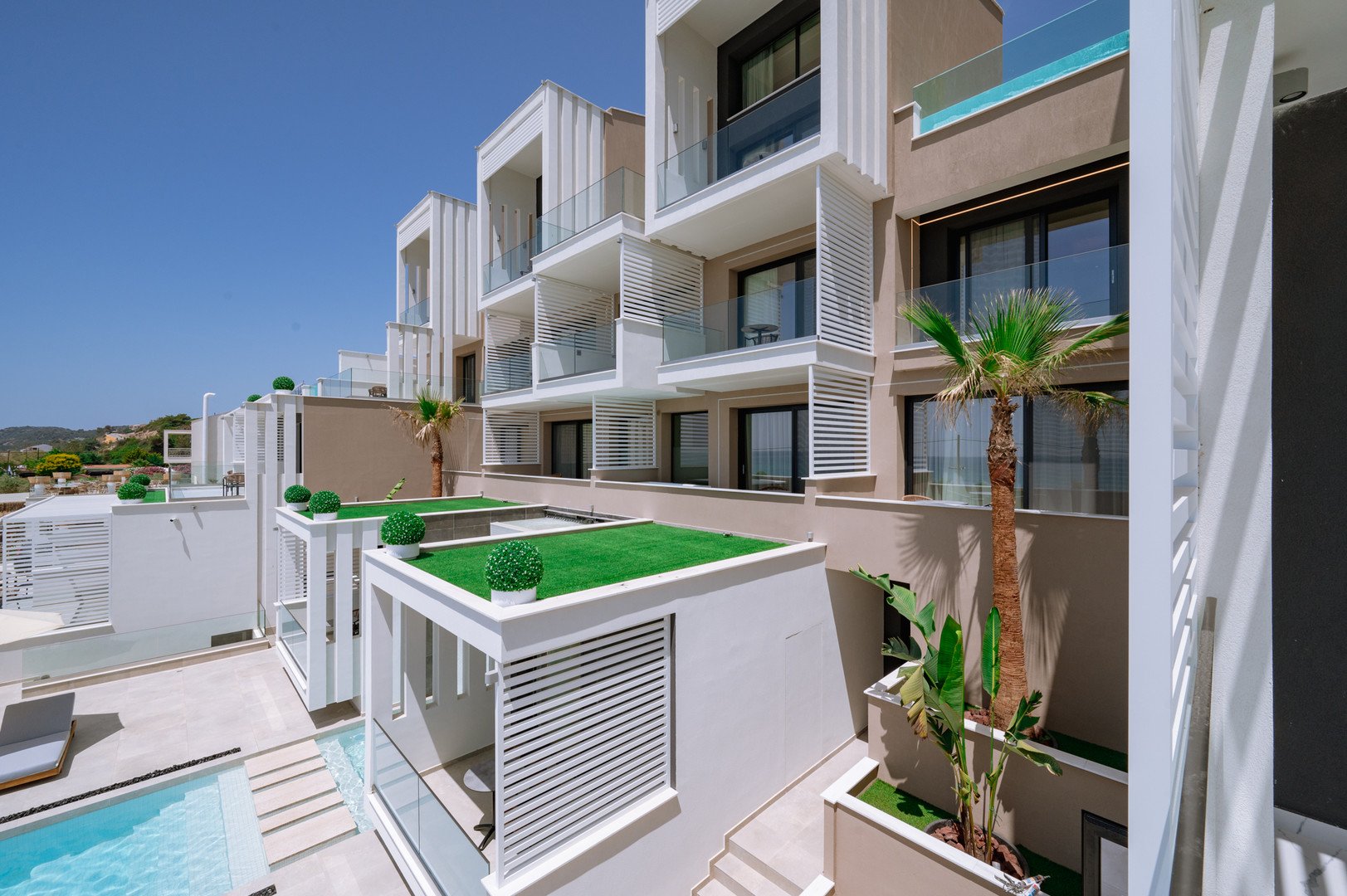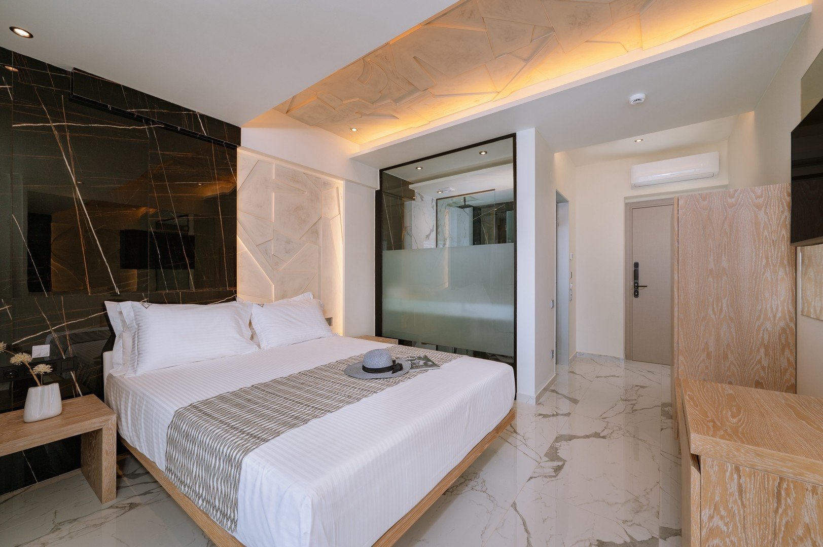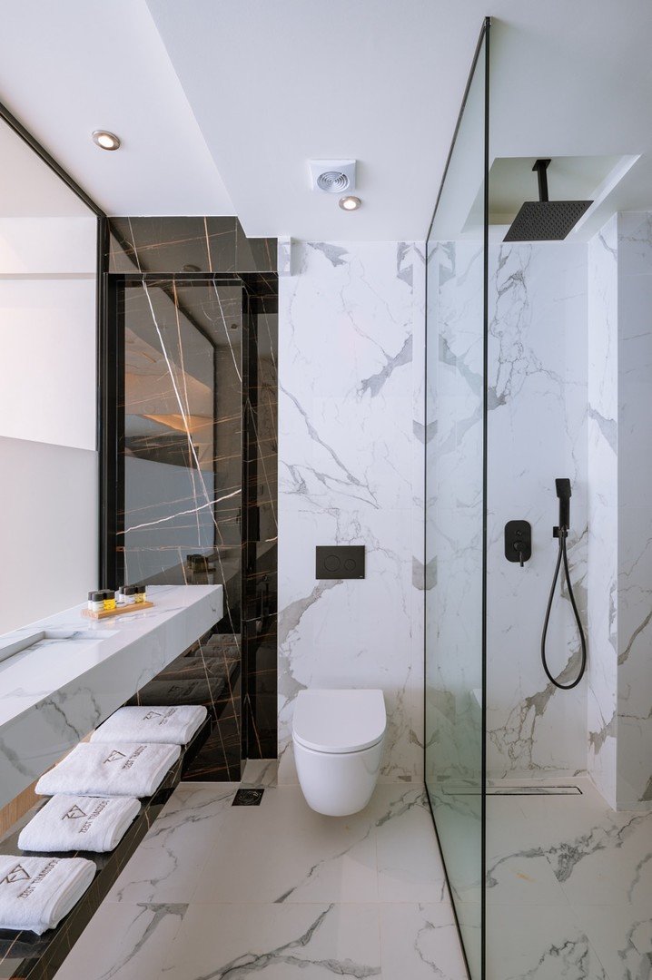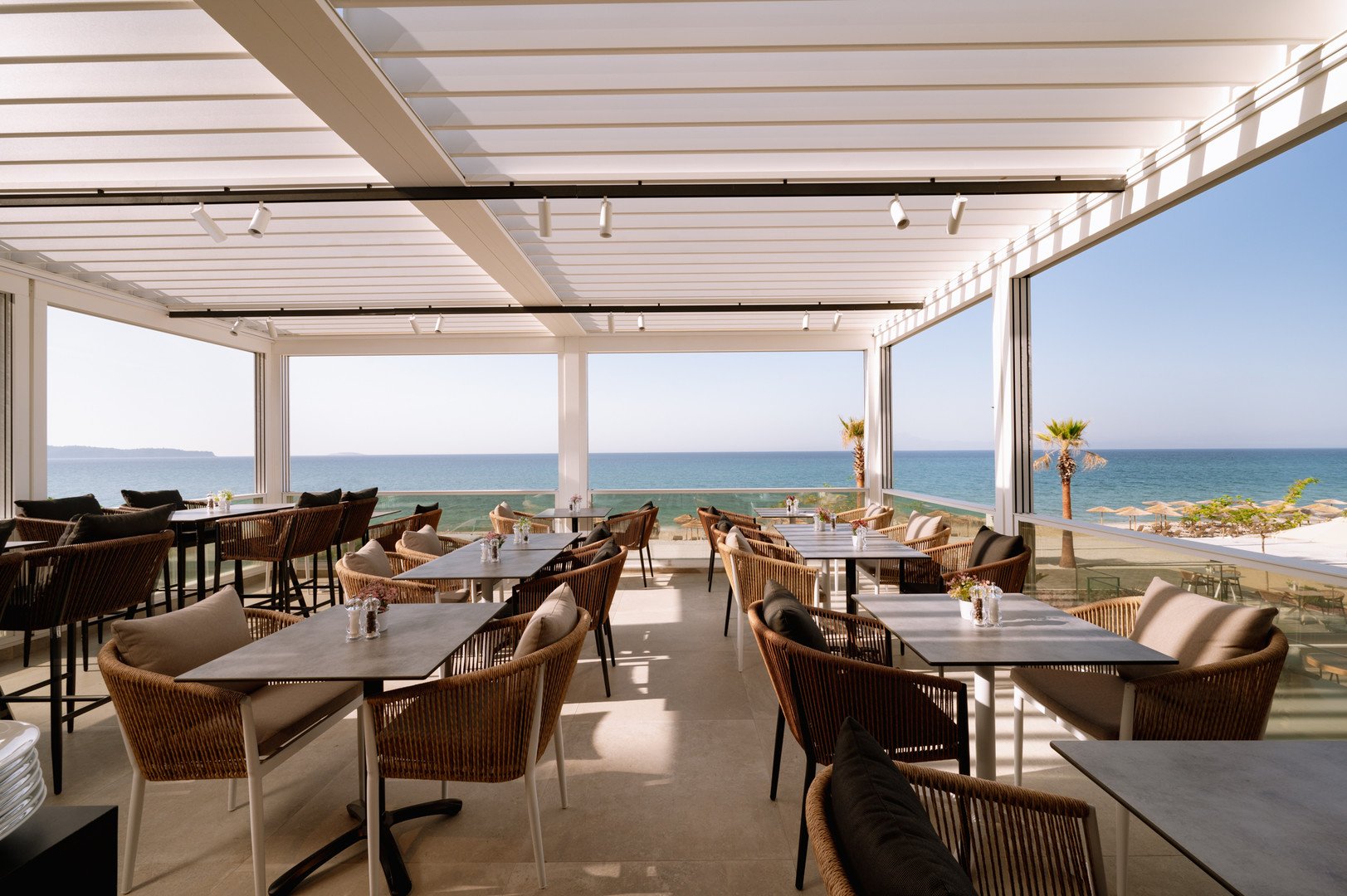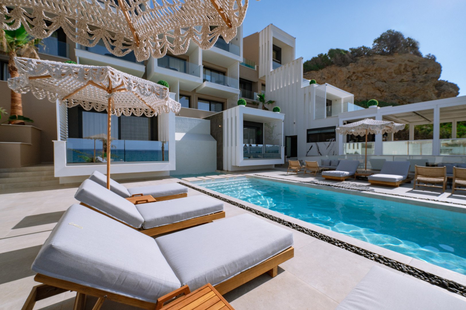 Deluxe dvoulůžkové pokoje s výhledem na moře bez možnosti přistýlky jsou vybaveny vlastní koupelnou (WC, sprcha, fén), WiFi, klimatizace, trezor, balkón nebo terasa.Za příplatek prostornější pokoje Junior Suite s výhledem na moře nebo na vyžádání Mezonetové pokoje.