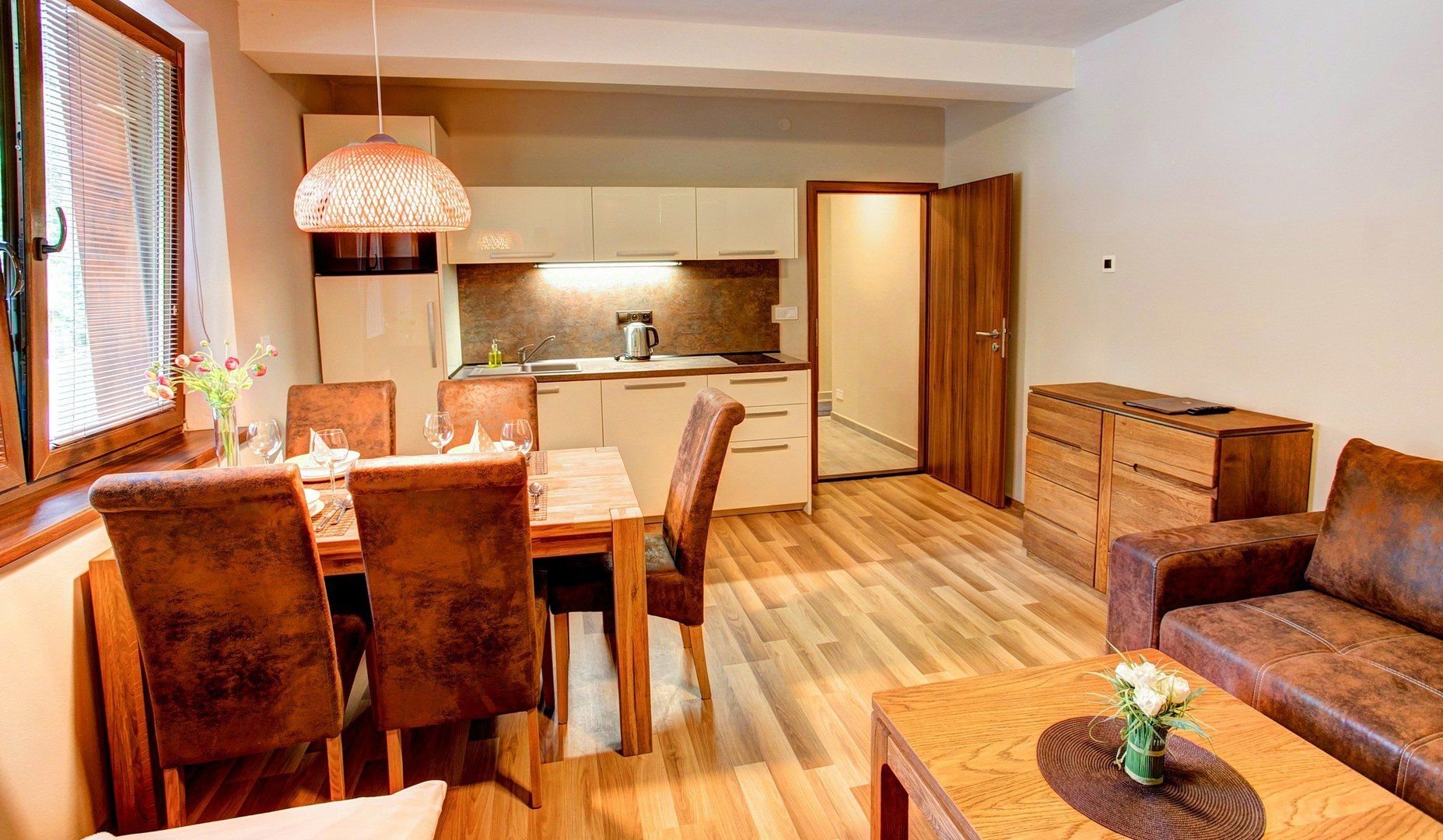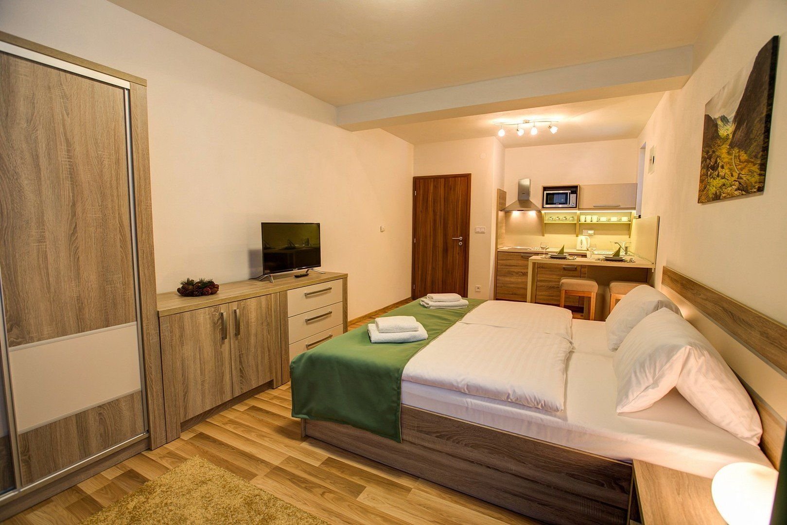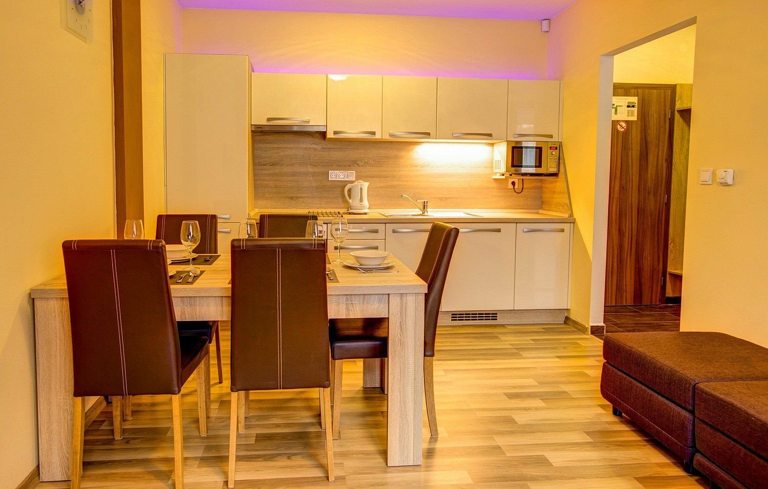 Všechny apartmány jsou stylově zařízeny. Ke každému apartmánu přísluší parkovací stání. Parkování je možné i v garáži.V každém apartmánu je plně vybavená kuchň, koupelan s toaletou, balkon s posezením, TV-sat, wifi a trezor.