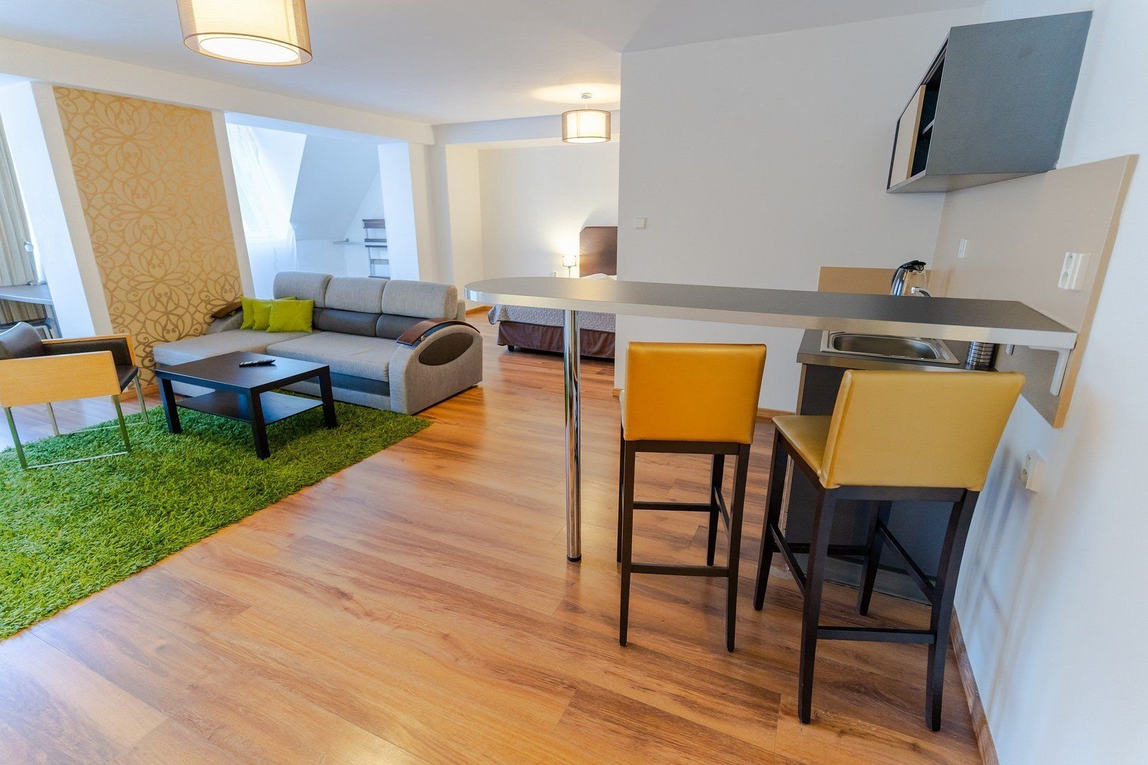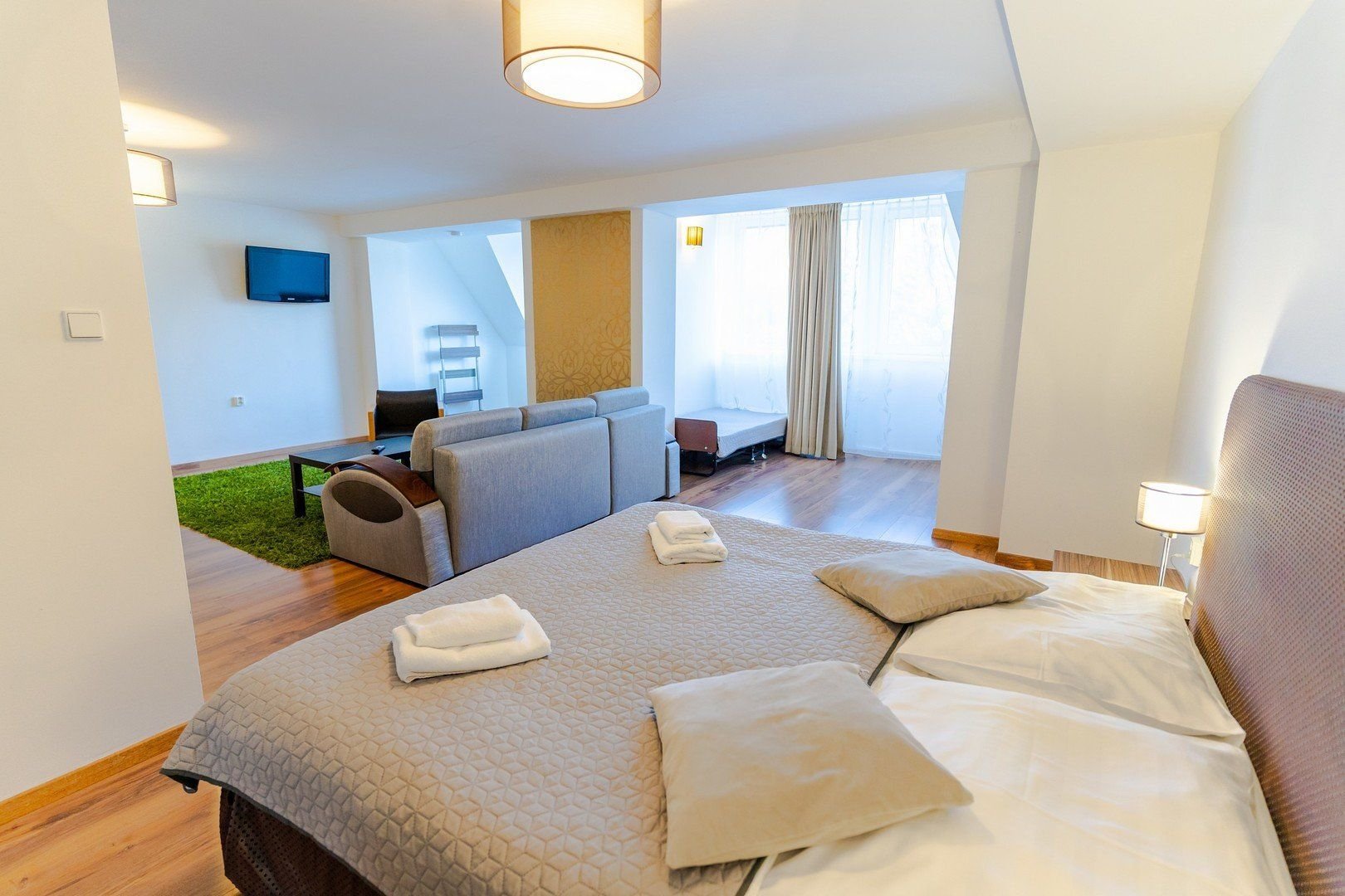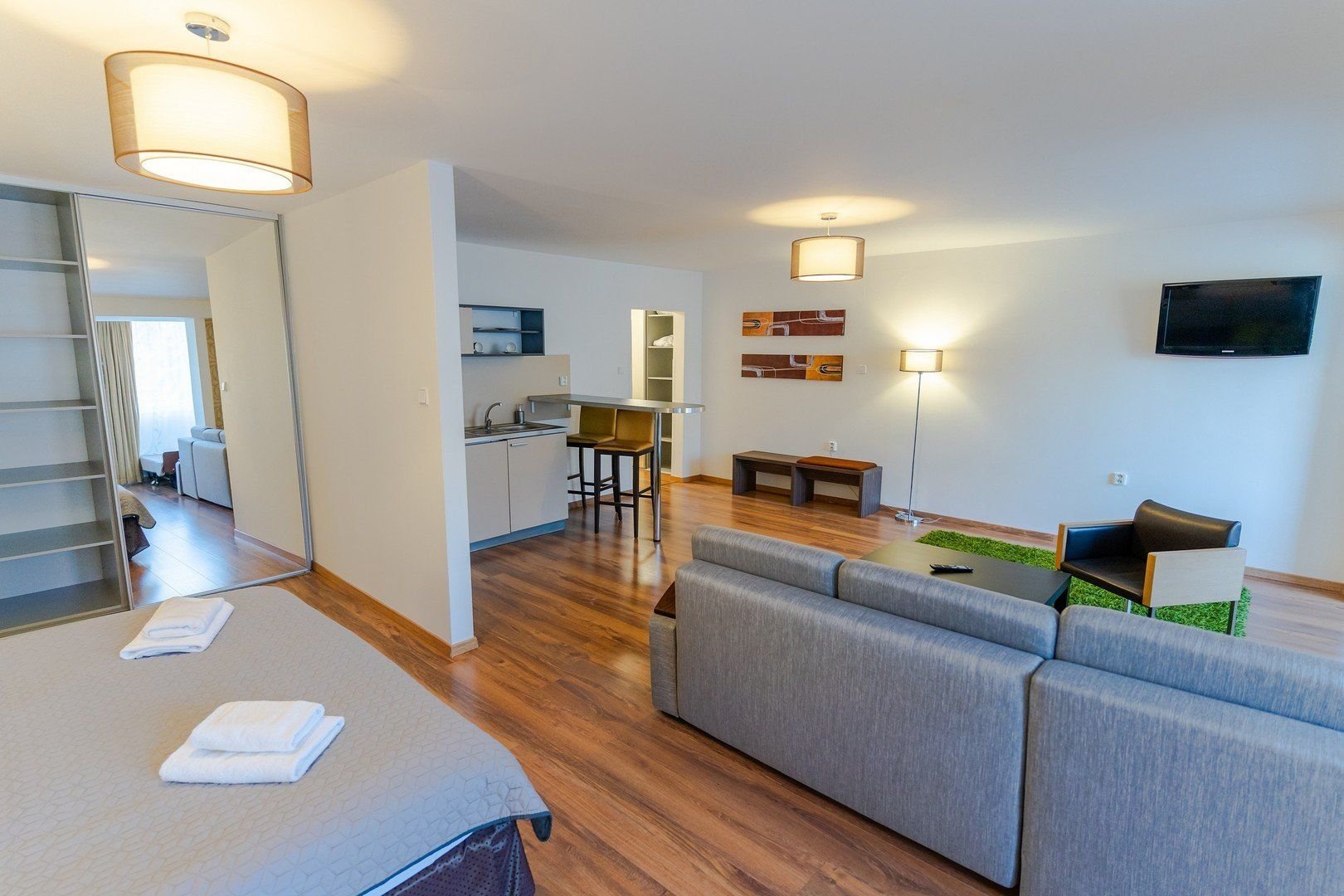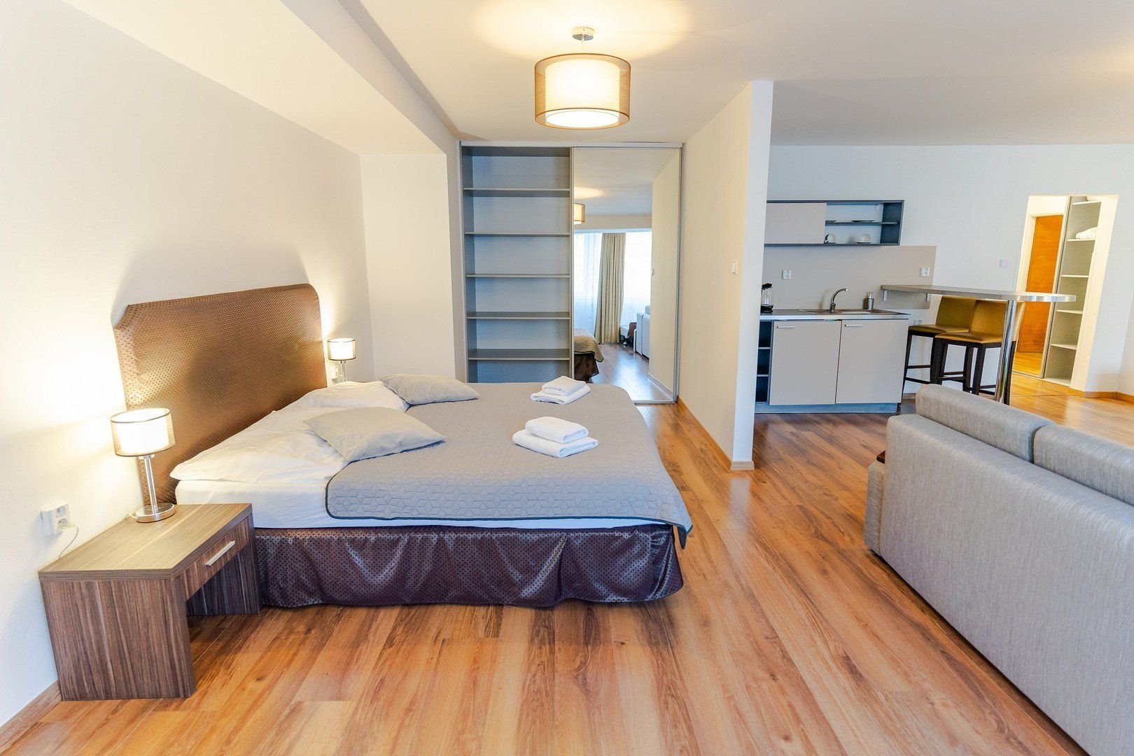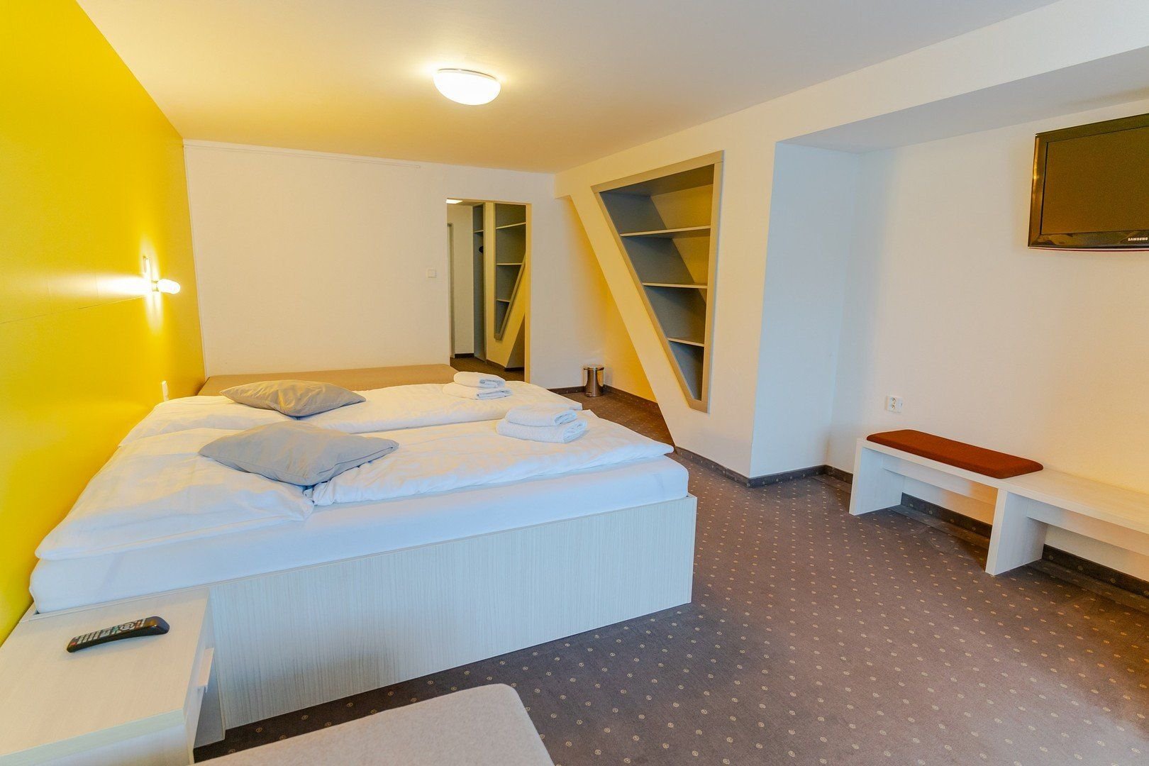 Hotel nabízí ubytování v komfortně zařízených pokojích a apartmánech.Dvoulůžkový pokoj s možností 2 přistýlek - manželská postel, rozkládací gauč jako přistýlka, koupelna se sprchovým koutem, samostatná toaleta, SAT TVApartmán s 1 ložnicí - oddělená ložnice, obývací část s rozkládacím gaučem jako přistýlkou, koupelna se sprchovým koutem a toaletou, SAT TV, ledničkaRodinný pokoj - manželská postel, rozkládací gauč jako přistýlka, chladnička, SAT TV, koupelna se sprchovým koutem a toaletou