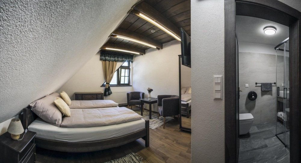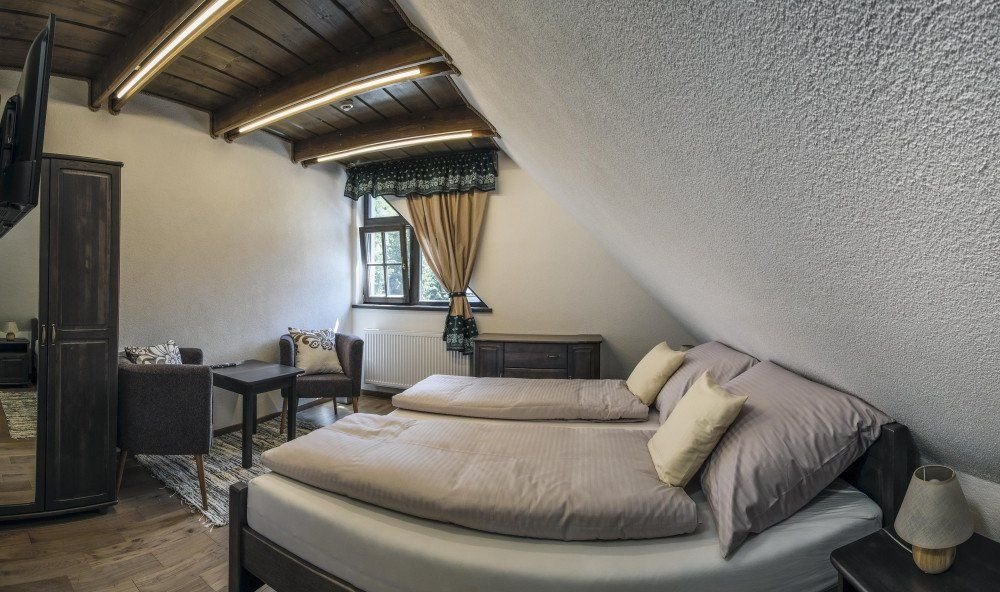 Ubytovací kapacity poskytují ubytování ve 3 dvoulůžkových pokojích a 5 apartmánech. *dvoulůžkové pokoje s manželskou postelí, koupelnou a toaletou, varnou konvicí a fénem*apartmány - ložnice s manželskou postelí, obývací místnost, koupelna s toaletou, chladnička, varná konvice a fénDomeček u jezírka ( novinka )- samostatně stojící domek s kapacitou ubytování 8 pevných lůžek + 4 přistýlky ( 2x dvoulůžkový pokoj , 2x dvoulůžkový apartmán s obývací částí a 2 přistýlkami )- parkování přímo před domem, Wifi- plně vybavená kuchyň s jídelnou, soukromá zahradka s možností venkovního posezení a grilem- v ceně pobytu 3 hodinový vstup do wellness centra