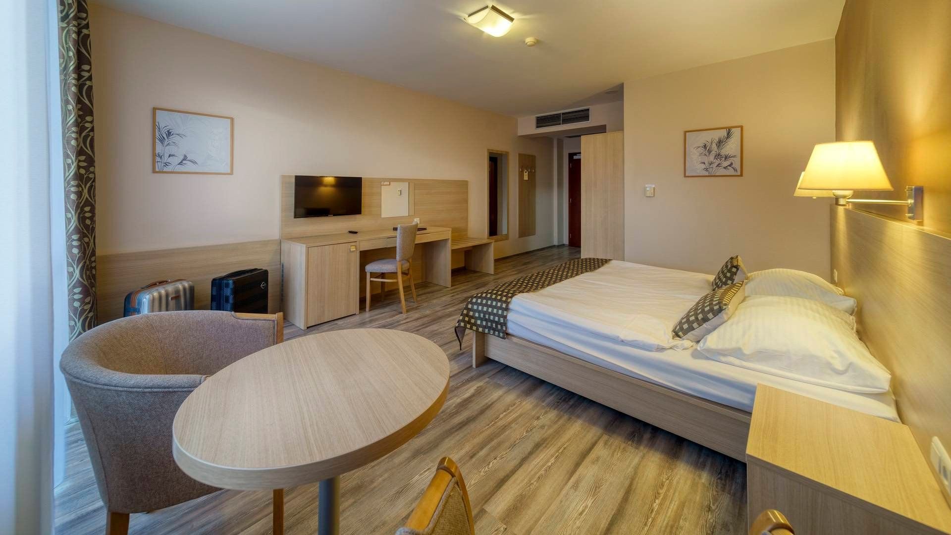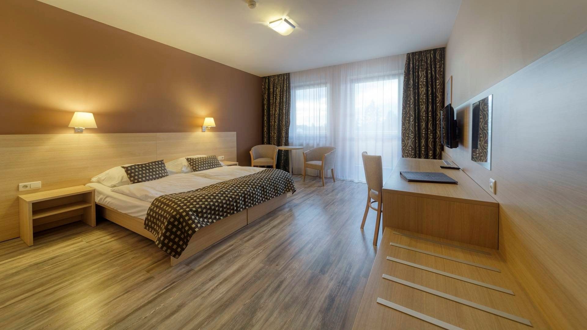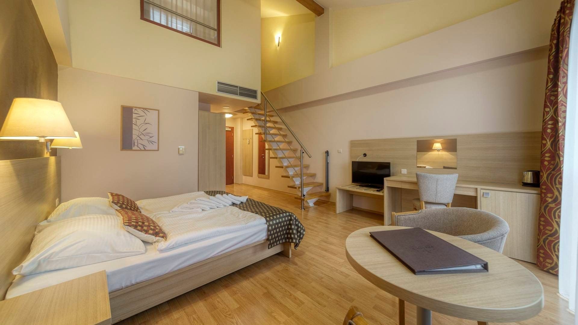 Hotel disponuje ubytováním v 98 pokojích různých katagorií. Všechny pokoje jsou moderně a vkusně vybavené. V každém z nich neleznete koupelnu se sprchou a toaletou, minibar, kabelovou televizi, klimatizaci, župan a papuče do wellness jsou samozřejmostí.* dvoulůžkový pokoj Standard, Economy, Superior a různé typy apartmánů pro 2 - 6 osob* rodinný pokoj pro 4 osoby - mezonetový pokoj se dvěmi samostatnými ložnicemi* apartmány