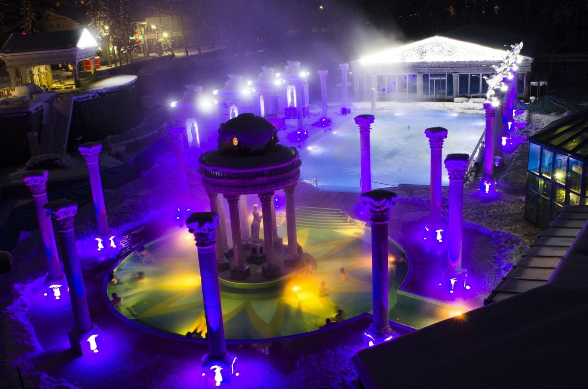 Minerální termální bazén:Celotělová koupel v přírodní léčivé vodě, který má příznivý analgetický a relaxační účinek na pohybový aparát. Teplota léčivé vody v bazénu má nejvýraznější relaxační účinky na kosterní svalstvo.Účinky: relaxační, analgetické, vazodilatečné, zlepšení celkového metabolismuTeplota: 38 ° - 39 ° CVoda: přírodní léčiva hydrogenuhličitanových, vápenato-hořečnatá voda.Rehabilitační bazén:Celotělový koupel v přírodní léčivé vodě s možností využití speciálních hydromasážních a vzduchových trysek přizpůsobených na masáž zad, horních končetin a sedací části. Bazén stejně slouží k hydrokinezioterapii pod dohledem fyzioterapeuta.Účinky: relaxační, regenerační, sedatítvny, zlepšení celkového metabolismuTeplota: 31,5 ° - 32,5 ° CVoda: přírodní léčiva hydrogenuhličitanových, vápenato-hořečnatá voda. Klidový bazén:Sedací kruhový bazén s antickým altánkem, vybavený vodními masážními tryskami a teplotou vody 36-38 ° C. Bazén je propojen vyplaví s vnitřním areálem.Účinky: léčebné, relaxační, regenerační, zklidňujícíVoda: termální léčivá voda. Rekreační / plavecký bazén:25 m dlouhý bazén s teplotou vody 26-28 ° C situován uprostřed nádherné antické architektury.Účinky: relaxační, regenerační, rekondičníVoda: termální léčivá voda. Turecká koupel:Celotělový střídavá koupel v horké a studené přírodní termální vodě na posílení kardiovaskulárního aparátu a imunitního systému. Střídáním horkých a studených podnětů dochází ke stahování a uvolňování krevních a lymfatických cév, k uvolnění svalstva a celkové imunologické reakci organismu. Teplota horký bazén: 40 - 41 ° C Doporučený čas pobytu: 5 - 10 minutÚčinek: vazodilatační, spasmolytický, analgetický, regenerační, kosmetický a anticelulitidní Teplota studený bazén: 12 - 14 ° C Doporučený čas pobytu: 1 - 2 minuty . Rodinný bazén pod bralom:Bazén pod bralom z přírodního kamene s padajícím vodopádem a teplotou vody 34 - 35 ° C. Bazén je vhodný pro rodiny s dětmi, kde je povoleno používat vodní pomůcky jako jsou kola a rukávníky.Účinky: posílení imunity a celkové odolnosti organismu. Voda: termální léčivá voda.