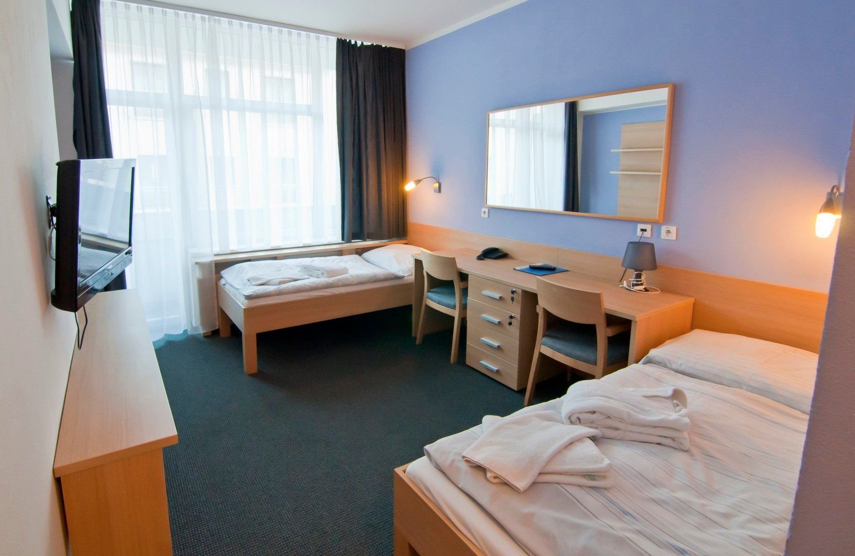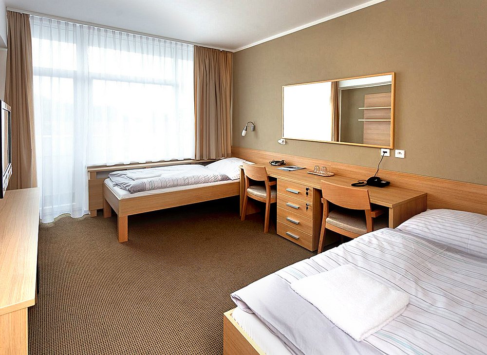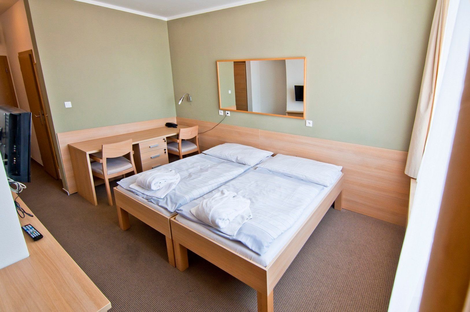 Všechny pokoje jsou komfortně vybavenyTypy pokojů: * jednolůžkový pokoj Comfort* dvoulůžkový pokoj Comfort* apartmán* 4 bezbariérové pokoje, z toho 3 dvoulůžkové pokoje. * jednolůžkový a dvoulůžkový pokoj Comfort: vybavení - TV, WiFi, rádio, telefon, lednice, varná konvice, trezor, fén, sprcha a WC.* apartmán: vybavení - TV, WiFi, rádio, telefon, lednice, varná konvice, trezor, fén, sprcha/vana a WC