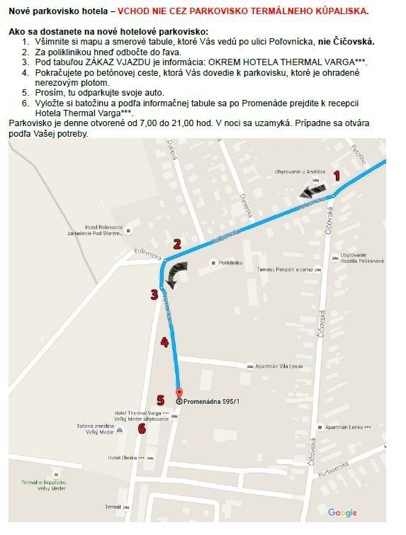 * Příjezd : od 15hod* Odjezd do 11hod* V ceně není zahrnut rekreační poplatek, který se platí po příjezdu ve výši 1,5€/osobu od 3 let a noc.* Domácí zvířata nejsou povolena.* Uzavřené parkoviště za poplatek 3€/auto a noc. Poplatek se hradí v termínu 20.06. - 10.09., v době Velikonoc a Silvestra* Župan pro dospělé a děti od 3 let na pokoji ( župan je možné používat do areálu Termálního koupaliště, osušky se z hotelu neodnášejí )* Klimatizace na pokojích jen v měsících červenec a srpen* Stravování se poskytuje v hotelu Thermal Varga* Bezbariérový vstup Hotel Aqua - hlavní vchod + vchod z parkoviště ( bezbariérový apartmán )* Bezbariérový vstup Hotel Thermal Varga - zadní vchod z hotelového dvora* Hoteli jsou jednopatrové a nemají výtah