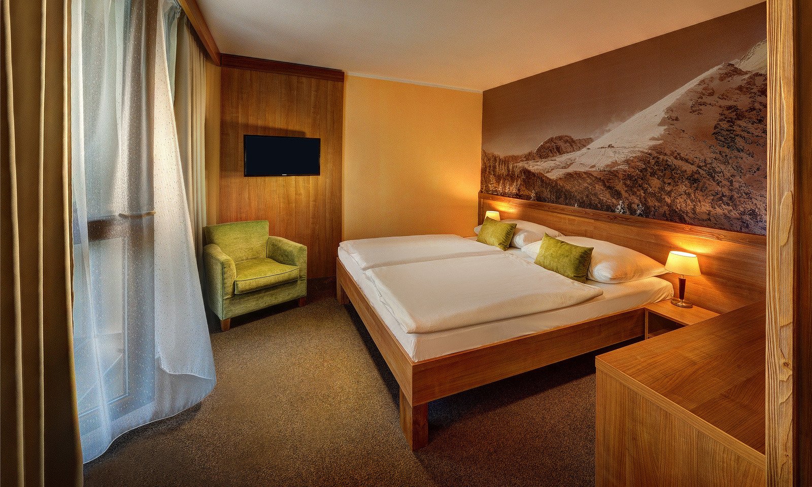 Dvoulůžkové pokoje Economy Twin. Možné i dvoulůžkové pokoje Standard a rodinné pokoje na vyžádání. Vybavení: koupelna, sprcha, sociální zařízení, fén, župan a přezůvky k zapůjčení za poplatek, balkon nebo terasa, topení, pohovka, TV.