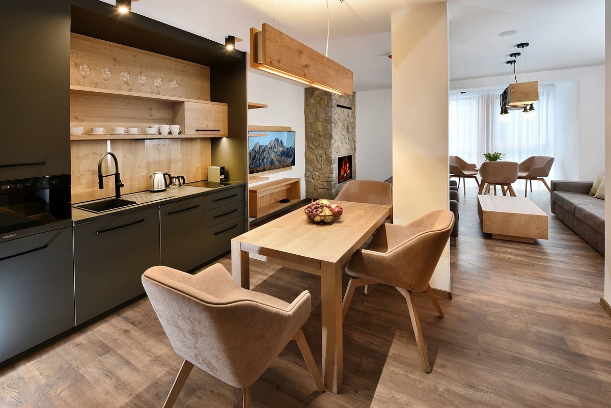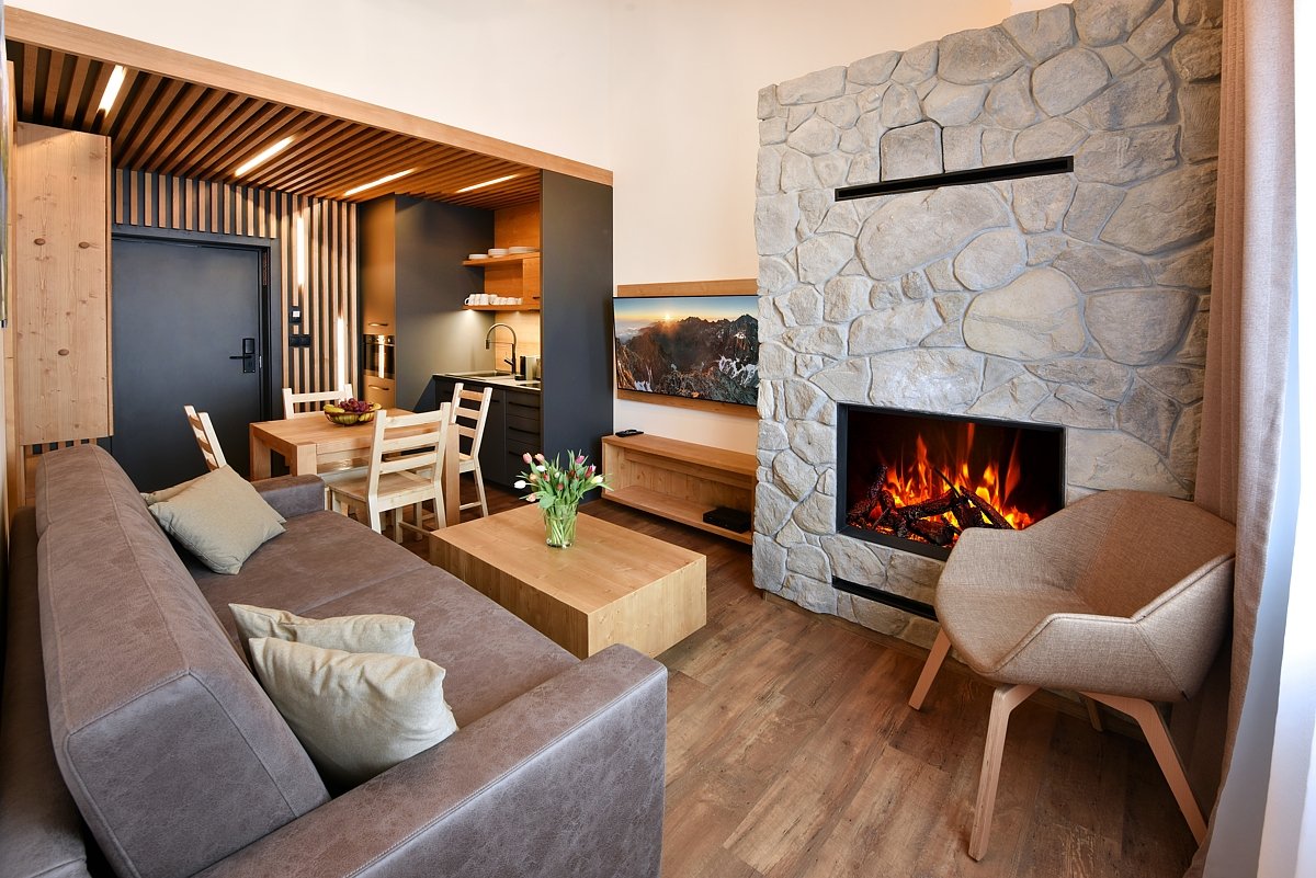 Apartmán 2+0 (ložnice s manželskou postelí, obývací pokoj s pohovkou, TV, koupelna se sprchovým koutem, fénem, kuchyňka s myčkou nádobí, varnou deskou, rychlovarnou konvicí, ledničkou, kávovarem, mikrovlnou troubou, jídelní kout. Deluxe Apartmán 2+2 (Ložnice s manželkou postelí, obývací pokoj s rozkládací pohovkou pro 2 osoby, TV, kuchyně s myčkou nádbí, varnou deskou, rychlovarnou konvicí, ledničkou, kávovarem, mikrovlnou troubou, koupelna se sprchovým koutem, fénem na vlasy. Studio Standard 2+0 (Ložnice s manželskou postelí, obývací pokoj s pohovkou, TV, koupelna se sprchovým koutem, fénem, kuchyňka s myčkou nádobí, varnou deskou, rychlovarnou konvicí, ledničkou, kávovarem, mikrovlnou troubou, jídelní kout. Studio Galéria 2+3 (otevřená ložnice s manželskou postelí, otevřený pokoj s jedním lůžkem na poschodí, přístup po žebříku, obývací pokoj s pohovkou, TV, koupelna se sprchovým koutem, fénem, kuchyňka s myčkou nádobí, varnou deskou, rychlovarnou konvicí, ledničkou, kávovarem, mikrovlnou troubou, jídelní kout. Studio Deluxe 2+2 (otevřená ložnice s manželskou postelí, obývací pokoj s pohovkou, TV, koupelna se sprchovým koutem, fénem, kuchyňka s myčkou nádobí, varnou deskou, rychlovarnou konvicí, ledničkou, kávovarem, mikrovlnou troubou, jídelní kout. Premium Apartmán 2+2 (Ložnice s manželskou postelí, obývací pokoj s rozkládací pohovkou pro 2 osoby, TV, koupelna se sprchovým koutem, fénem, kuchyňka s myčkou nádobí, varnou deskou, rychlovarnou konvicí, ledničkou, kávovarem, mikrovlnou troubou, jídelní kout, balkon s venkovním posezenímApartmán Deluxe s dvěma ložnicemi 4+2 (2 ložnice s manželskou postelí, obývací pokoj s rozkládací pohovkou pro 2 osoby, TV, koupelna se sprchovým koutem, fénem, kuchyňka s myčkou nádobí, varnou deskou, rychlovarnou konvicí, ledničkou, kávovarem, mikrovlnou troubou, jídelní kout, balkon.