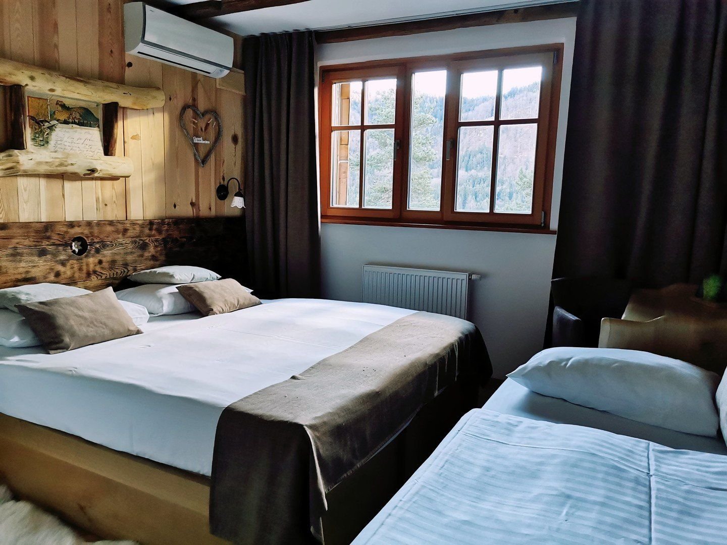 Hotel nabízí ubytování ve:Dvoulůžkovém pokoji s balkonem Dvoulůžkovém pokoji s přistýlkouVšechny pokoje jsou vybaveny klimatizací, TV, telefonem, koupelnou se sprchou, fénem, trezorem, Wi-Fi, ručníky, ložním prádlem. Ubytování v Glamping dřevěných chatičkách:Chata pro 4 osobyChaty jsou vybaveny venkovní vířivkou, infračervenou saunou, terasou s posezením, koupelnu se sprchou, mini lednici, TV, USB zásuvky, Wi-Fi, privátní úschovnu kol, nabíjecí stanici pro elektrokola, přenosná lehátka/ židle, ručníky, ložní prádlo.