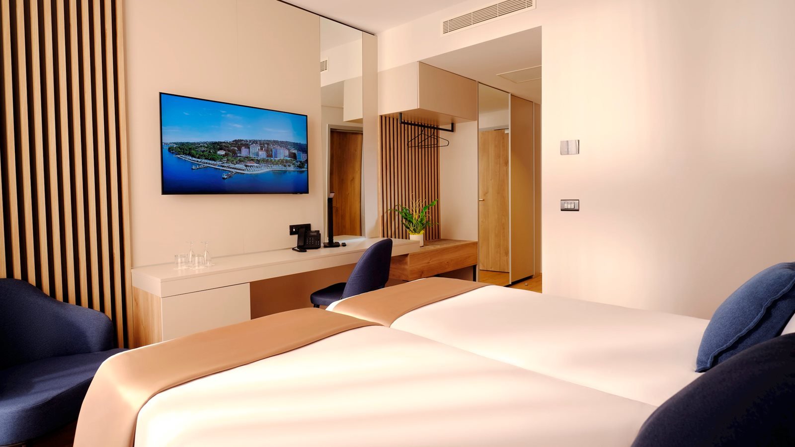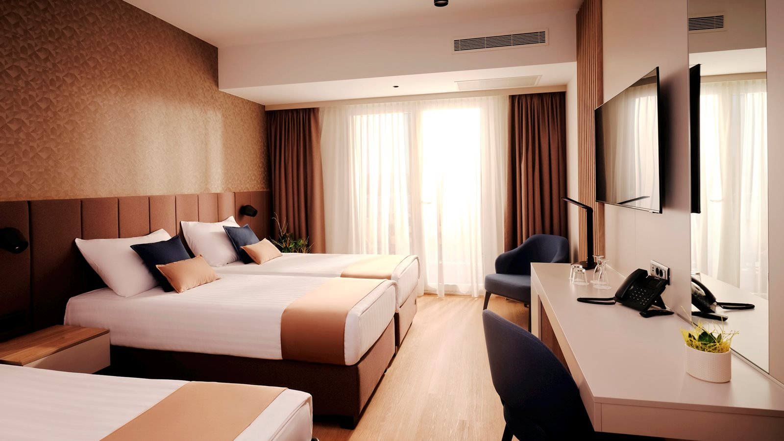 Moderní hotelové pokoje mají vlastní příslušenství (koupelna, vysoušeč vlasů, WC) a dále jsou vybaveny klimatizací, minibarem, TV/Sat., telefonem, trezorem a Wi-Fi připojením.