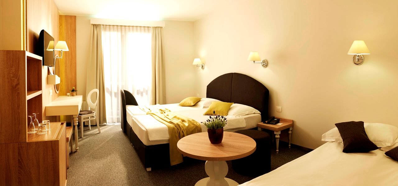 Vybavení pokojů: koupelna (sprcha/vana, WC, fén na vlasy), kabelová TV, telefon, mini bar (poplatek), klimatizace. Dětská postýlka možná na vyžádání a za poplatek (5 EUR/den).Typy pokojů:* dvoulůžkový pokoj, výhled na moře* dvoulůžkový pokoj s možností 1 přistýlky, výhled do zahrady* rodinný pokoj, výhled na moře - min. 4 osoby, max. 4 osoby