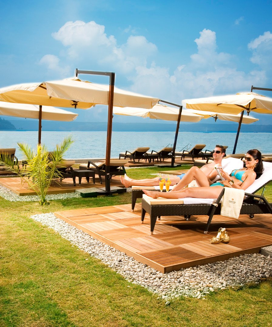 Krásně upravená travnatá pláž, která se rozprostírá mezi stromy, se nachází pouze pár metrů od hotelu. Vstup do moře je možný z dřevěného mola nebo z navazující betonové plochy.