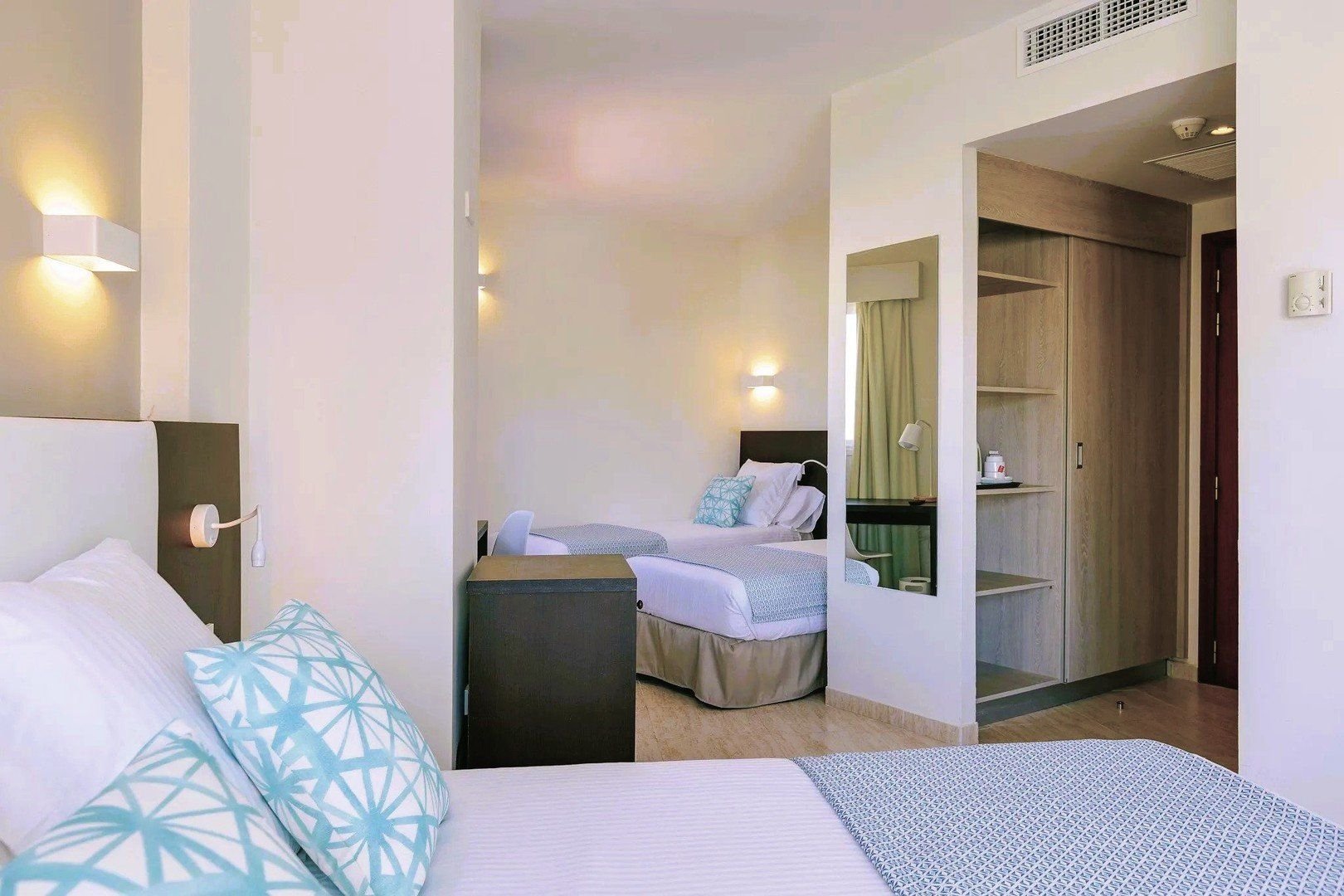 Standardní pokoje pro 2 osoby, s možností přistýlky pro děti do 13 let (pohovka nebo menší lůžko) jsou vybaveny vlastní koupelnou (fén, sprchový kout ve většině pokojích), klimatizací, TV/SAT, telefonem, za poplatek trezor, minibar; s balkonem, výhled do okolí. Za příplatek pokoje s výhledem na bazén. Moderní dvoulůžkové pokoje typu Superior za příplatek.Rodinné pokoje až pro 4 osoby jsou vybaveny stejně jako pokoje standard, místnost je opticky rozdělena do dvou částí, členitý prostor, 29,5 m2, manželské lůžko a přistýlky dvě menší single postele nebo jedna rozkládací pohovka; s balkonem, výhled do okolí. Dětská postýlka pro děti do 2 let zdarma.