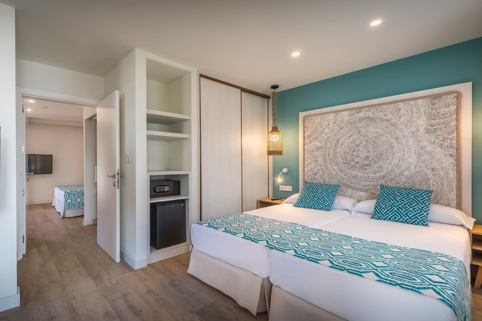 Standardní dvoulůžkové pokoje, cca 22 m², mají vlastní příslušenství (koupelna, WC, fén), klimatizaci, SAT/TV, minibar, WiFi zdarma, trezor (za poplatek), balkon nebo terasu. Za příplatek pokoje standard s bočním výhledem na moře.  Za příplatek prostornější rodinné pokoje až pro 4 osoby (1 místnost, 26 m²,  přistýlka rozkládací pohovka) a rodinný pokoj Deluxe - dvě částečně oddělené místnosti (přistýlka rozkládací pohovka), 32 m², zašupovací dveře. Za příplatek pokoje Superior až pro 3 osoby, jsou vybaveny stejně jako standardní pokoje, moderní design,  o něco větší prostory, 26 m², mohou být vyšší patra (nemusí být výtah přímo v patře daného pokoje). Na vyžádání bezbariérové pokoje.