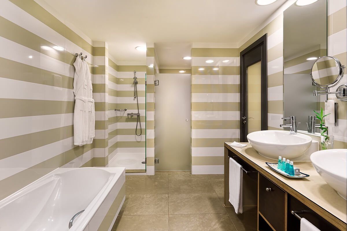 Dvoulůžkový pokoj Comfort Klimatizovaný pokoj má ve vybavení televizi se satelitními programy, rádio, telefon, bezplatné Wi-Fi připojení k internetu, minibar, trezor (zdarma), koupelnu s WC, vysoušečem vlasů a župany, balkon nebo terasu. Za příplatek je možné objednat pokoj s výhledem na bazén/do zahrady. Maximální obsazenost – 2 dospělé osoby a 1 dítě do 2 let. Dvoulůžkový pokoj Superior s výhledem na moře Základní vybavení je stejné jako u dvoulůžkového pokoje. Balkon má výhled na moře. Maximální obsazenost - 2 dospělé osoby a 1 dítě do 2 let. Junior Suite Standard Základní vybavení je stejné jako u dvoulůžkového pokoje, navíc má dvoulůžkovou ložnici oddělenou od obývacího pokoje vizuálně nebo dveřmi. Maximální obsazenost – 3 dospělé osoby a 1 dítě do 2 let. Suite Superior Základní vybavení je stejné jako u dvoulůžkového pokoje, ložnice je od obývacího pokoje oddělena dveřmi, ve vybavení má navíc druhou plazmovou televizi, v koupelně hydromasážní vanu nebo sprchu. Hostům je k dispozici denní tisk a snídaně à la carte. Balkon má výhled na moře. Maximální obsazenost – 3 dospělé osoby a 1 dítě do 2 let. Suite s výhledem na moře Základní vybavení je stejné jako u dvoulůžkového pokoje, je prostorný a dvoulůžková ložnice je od obývacího pokoje oddělena vizuálně nebo dveřmi. Ve vybavení navíc druhá plazmová televize, denní tisk a možnost snídaně formou à la carte. Maximální obsazenost – 3 dospělé osoby a 1 dítě do 2 let.