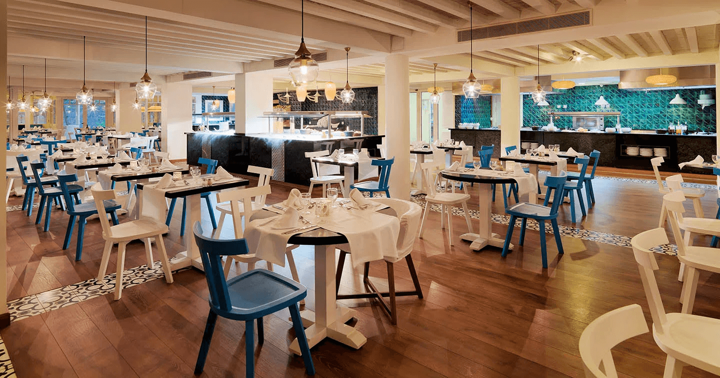 Hotel má hlavní restauraci Blue Bay, která nabízí snídaně a večeře formou bufetu s show cooking. Dále zahrnuje á la carte restauraci Naturalia, zaměřenou na středomořské pokrmy a čerstvé suroviny, a restauraci Blue Bay Night s nabídkou večeří na terase s výhledem na moře. K dispozici je také Cactus Bar u bazénu, specializující se na koktejly a lehké občerstvení, a kavárna Mike's Coffee s terasou.