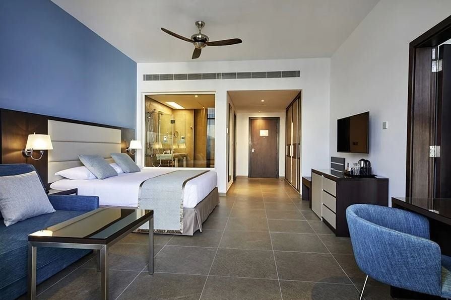 Pokoje jsou standardně určeny pro 2 osoby, možnost přistýlky formou rozkládací pohovky. Vybaveny klimatizací, SAT/TV, trezorem, telefonem, WiFi, minibarem (s nealkoholickými nápoji). Vlastní příslušenství (WC, sprchový kout nebo vana, vysoušeč vlasů), balkón. Za příplatek pokoje s částečným nebo přímým výhledem na moře.Rodinný junior suite - Dva propojené standardní pokoje.