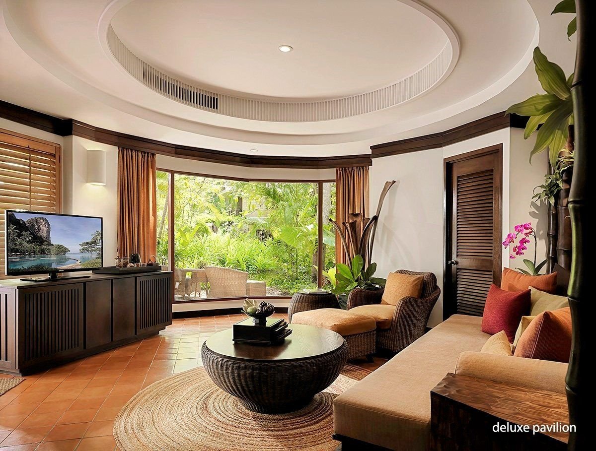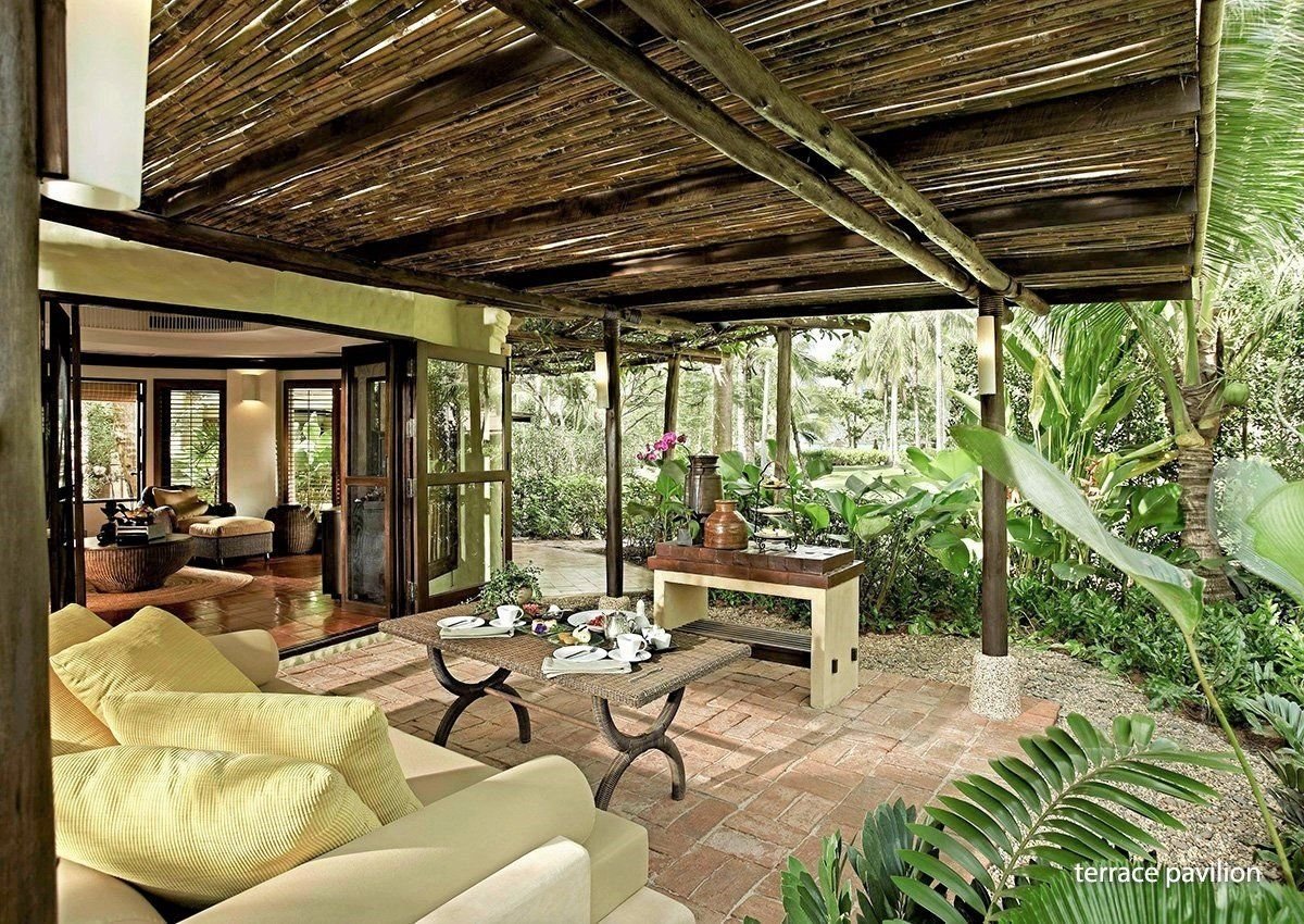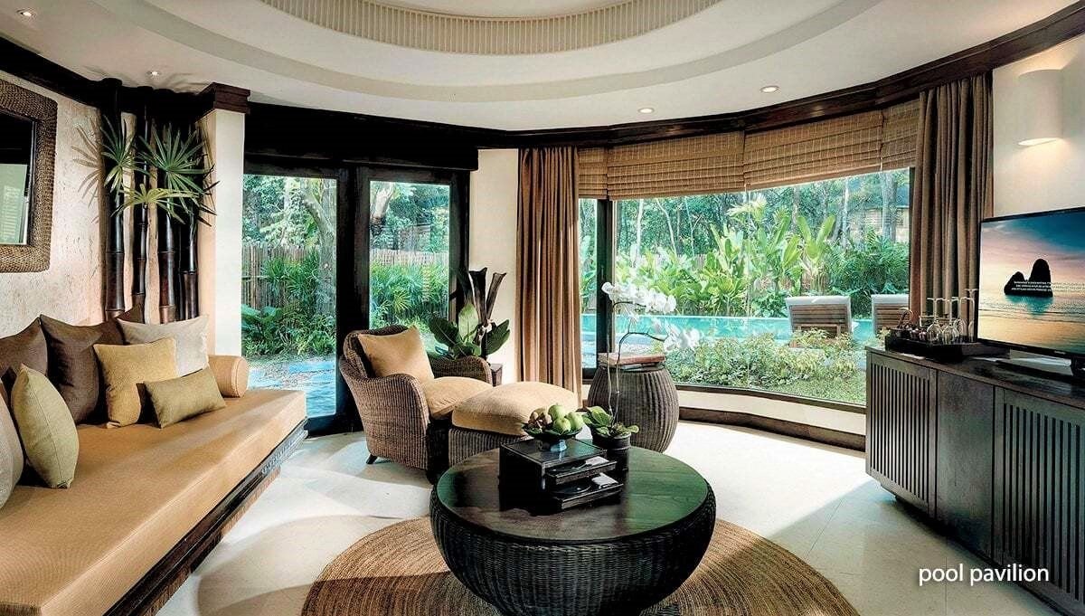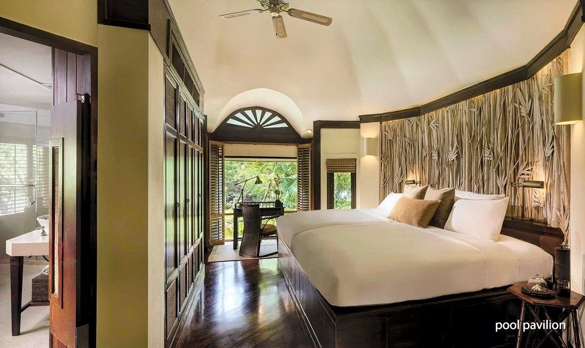 Dvoulůžkové pokoje Deluxe Pavilion (cca 90 m², dvoupatrové, stylový design) jsou plně vybavené a mají vlastní příslušenství (WC, koupelna, fén), SAT/TV, DVD, bezdrátový internet, příslušenství pro přípravu čaje a kávy a venkovní terasu. Za příplatek jsou k dispozici:- dvoulůžkové pokoje Terrace Pavilion (cca 115 m²) - stejné vybavení jako Deluxe Pavilion; otevřený obytný plán v přízemí, obývací část, prosklené dveře- dvoulůžkové pokoje Pool Pavilion (cca 115 m²) - soukromý bazén 3 x 8 m, ideální volba pro klienty vyžadující soukromí