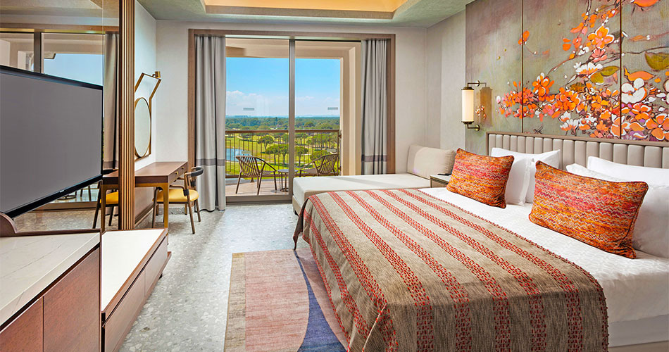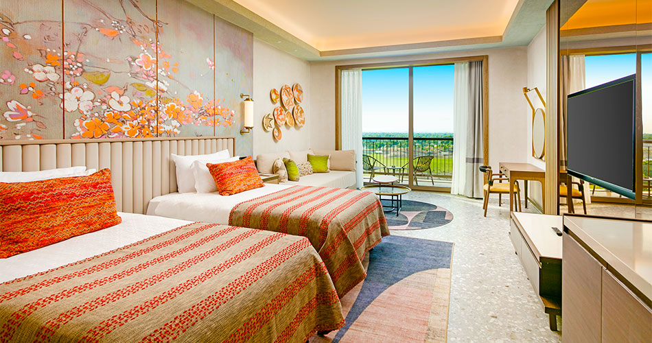 Superior Room: Tento pokoj nabízí komfortní vybavení včetně klimatizace, minibar, kávovar a chytré ovládání pokojových funkcí. Hosté mají přístup k luxusním toaletním potřebám, županu a pantoflím. Velikost pokoje je 45 m². Family Room: Tento rodinný pokoj je vhodný pro čtyři osoby a zahrnuje oddělený obývací prostor a ložnici. Má minibar, chytré ovládání funkcí, balkon, koupelnu s dešťovou sprchou a luxusní toaletní potřeby. Velikost pokoje je 70 m².Lagoon Room: Tento typ pokoje zahrnuje přímý přístup k bazénu z terasy, chytré ovládání, minibar a výběr polštářů. Varianta beach nebo golf. Velikost pokoje je 50 m².Stravování