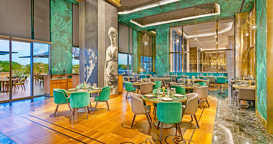 Hotel zahrnuje několik restaurací s různými zaměřeními. Hlavní restaurace nabízí mezinárodní kuchyni formou bufetu, zatímco à la carte restaurace se specializují na italskou, tureckou a středomořskou kuchyni. K dispozici je také snack bar, kavárna a několik barů, včetně plážového baru a baru u bazénu.Sport a zábava