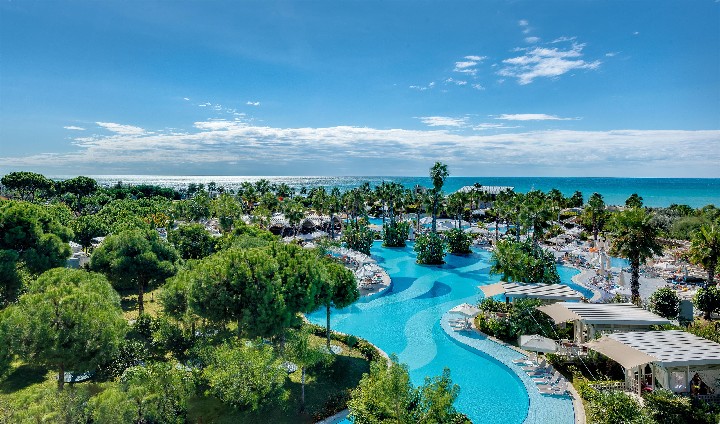 Hlavní pětipratrová budova s 8 výtahy a lake house budovy - 4 patra, taktéž 8 výtahů. Vstupní hala s recepcí (24 hod.), hlavní restaurace Turquoise, směnárna, výtahy, WiFi zdarma, hlavní restaurace, 6 a la carte restaurací (turecká a mexická po předchozí rezervaci 1x zdarma), 2 snack bary, 11 barů včetně Lobby baru (24/7), sport baru (16:00-24:00), cukrárna, několik konferenčních místnost, obchody, krytý bazén. 5 venkovních bazénů, aquapark, terasa na slunění s lehátky, slunečníky a osuškami zdarma. Za poplatek lékař, prádelna, pokojová služba, kadeřník, fotograf. Akceptované karty Visa, Master Card.Ubytování